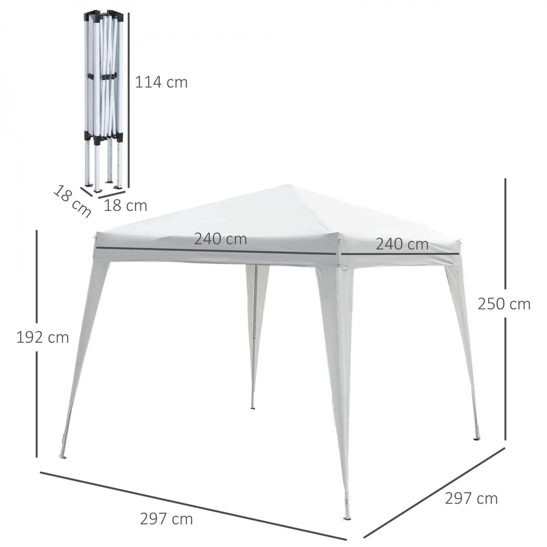 - MEDIDAS TOTALES: Las medidas de la carpa son 240x240x250 cm (LxANxAL), con una altura de alero de 192 cm. Nota: No se debe usar en condiciones de mal tiempo, como fuertes vientos, lluvias, tormentas o nieve, para proporcionar su durabilidad y seguridad