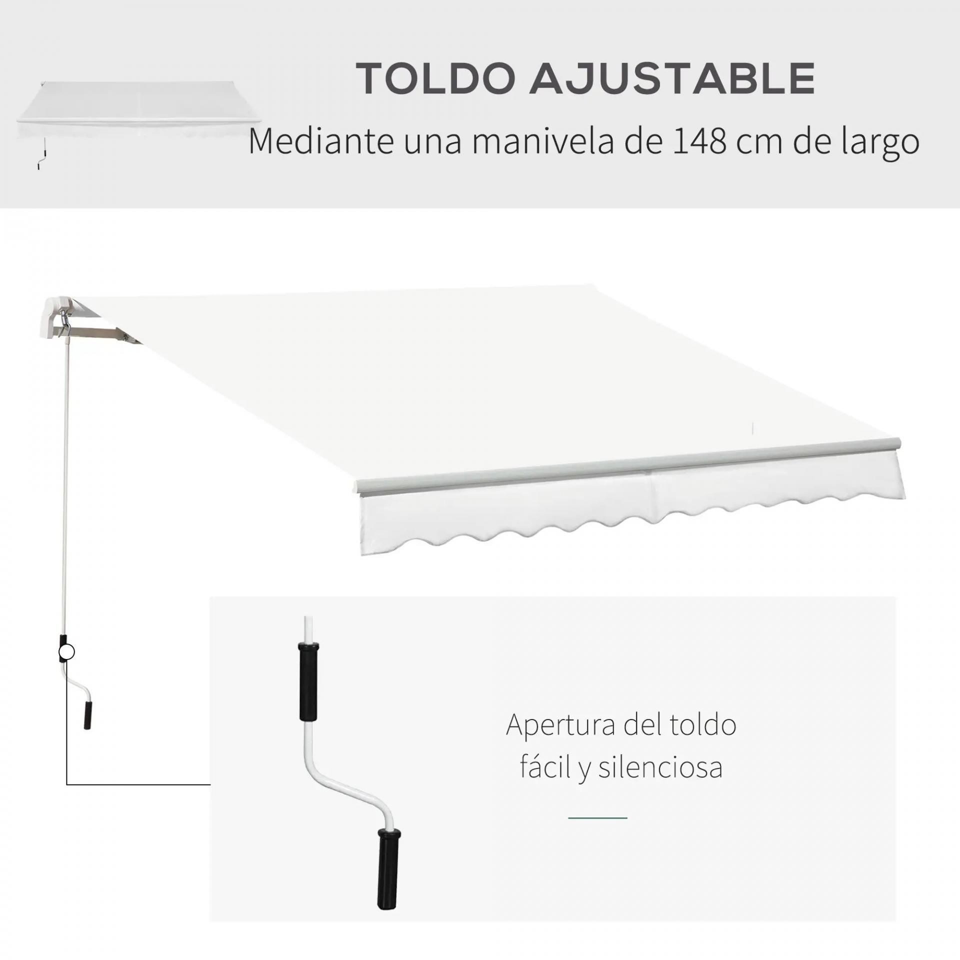 MEDIDAS TOTALES: 350x250 cm (LxAN). Medidas de la manivela: Ø13x1480 mm (DxAL). Longitud del borde: 23 cm. Toldo recomendado para la incidencia de luz solar y no para condiciones meteorológicas adversas. La instalación es responsabilidad del comprador. Requiere montaje. Nota: Si llueve mucho puede acumularse agua en el tejido del toldo y causar daños, por lo que debes recogerlo
