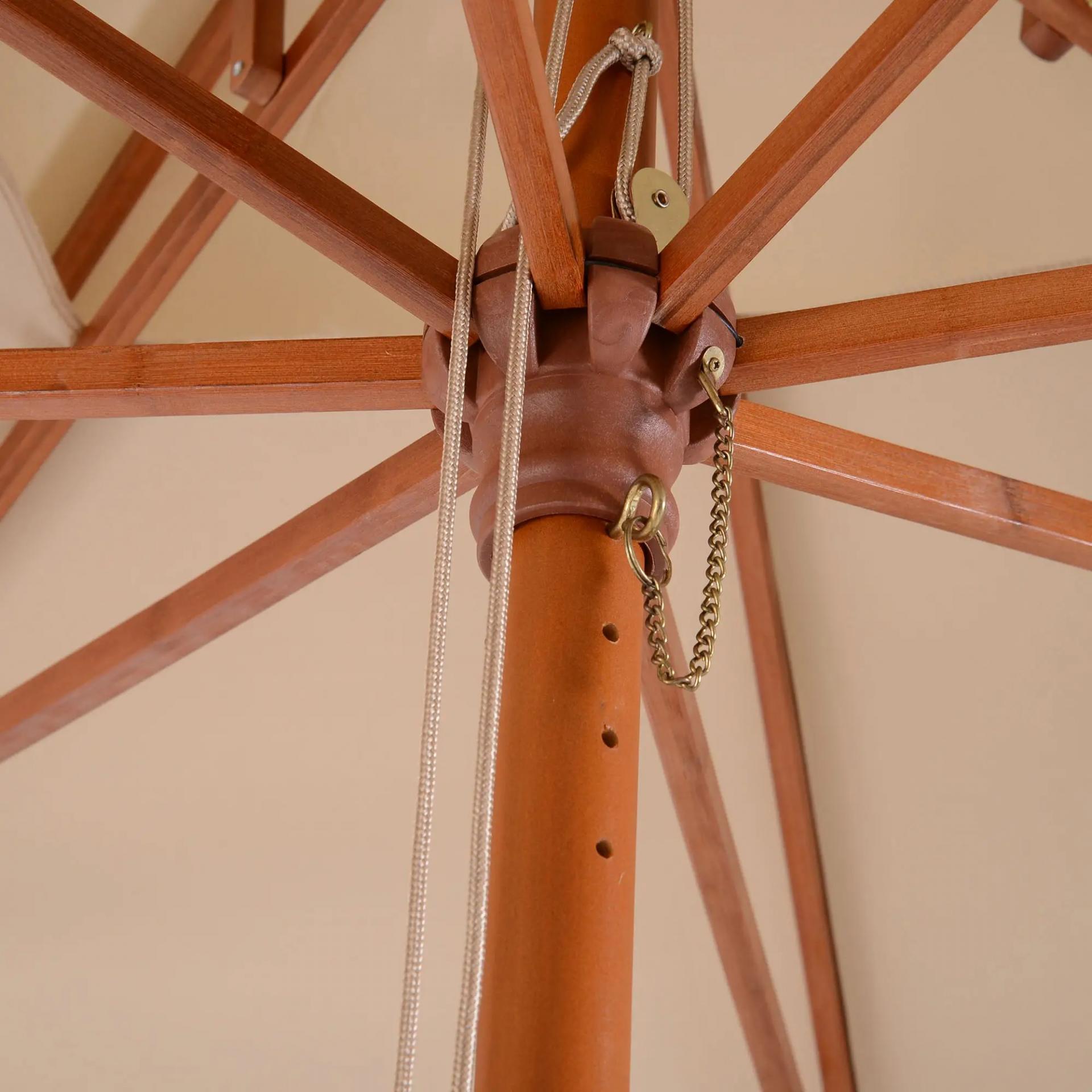 - APERTURA Y CIERRE CON POLEA: Sombrilla de terraza muy fácil de utilizar gracias a su mecanismo de apertura y cierre mediante sistema de poleas. Tan solo tendrás que tirar del cordón hasta que llegues a la posición para fijarla con el pasador