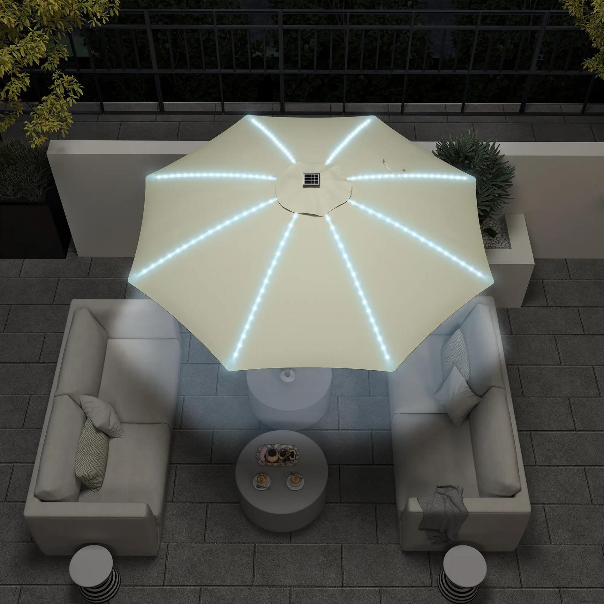 - AMBIENTE NOCTURNO ENCANTADOR: Con luces LED integradas en las varillas, esta sombrilla crea una iluminación suave para disfrutar del jardín hasta la noche. Funciona con energía solar y tiene puerto USB para recargar