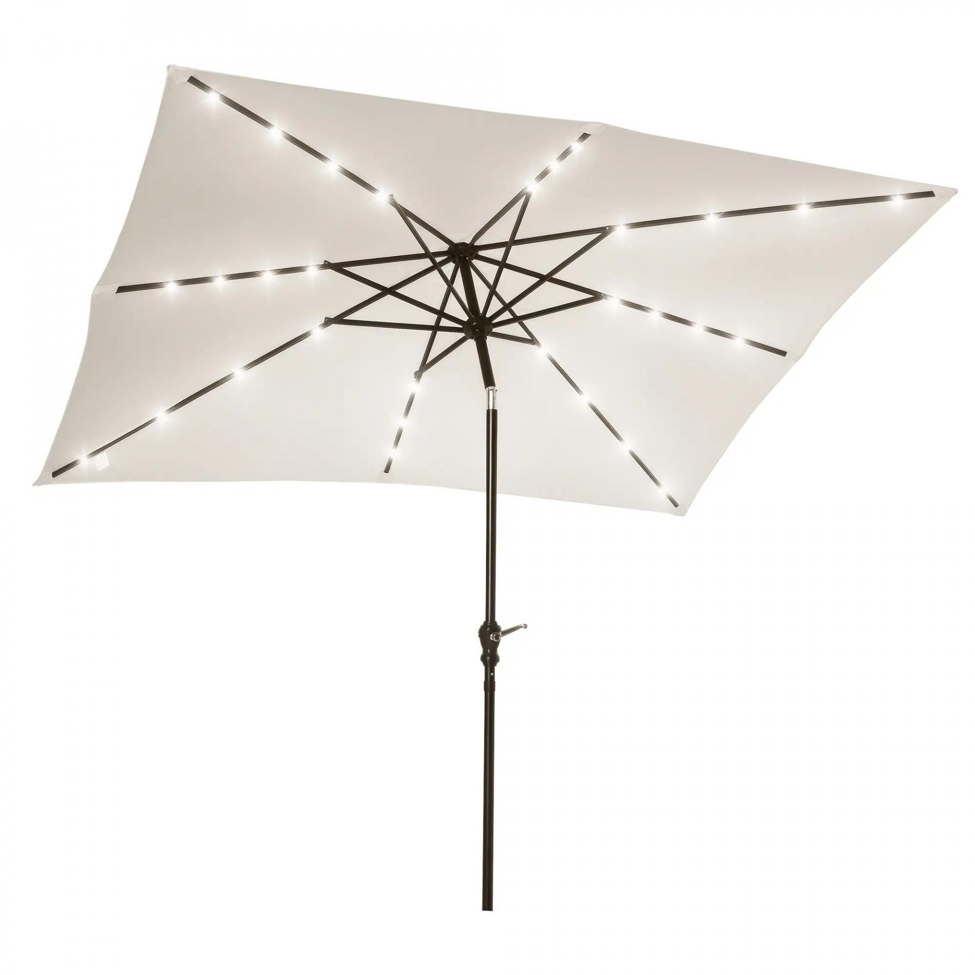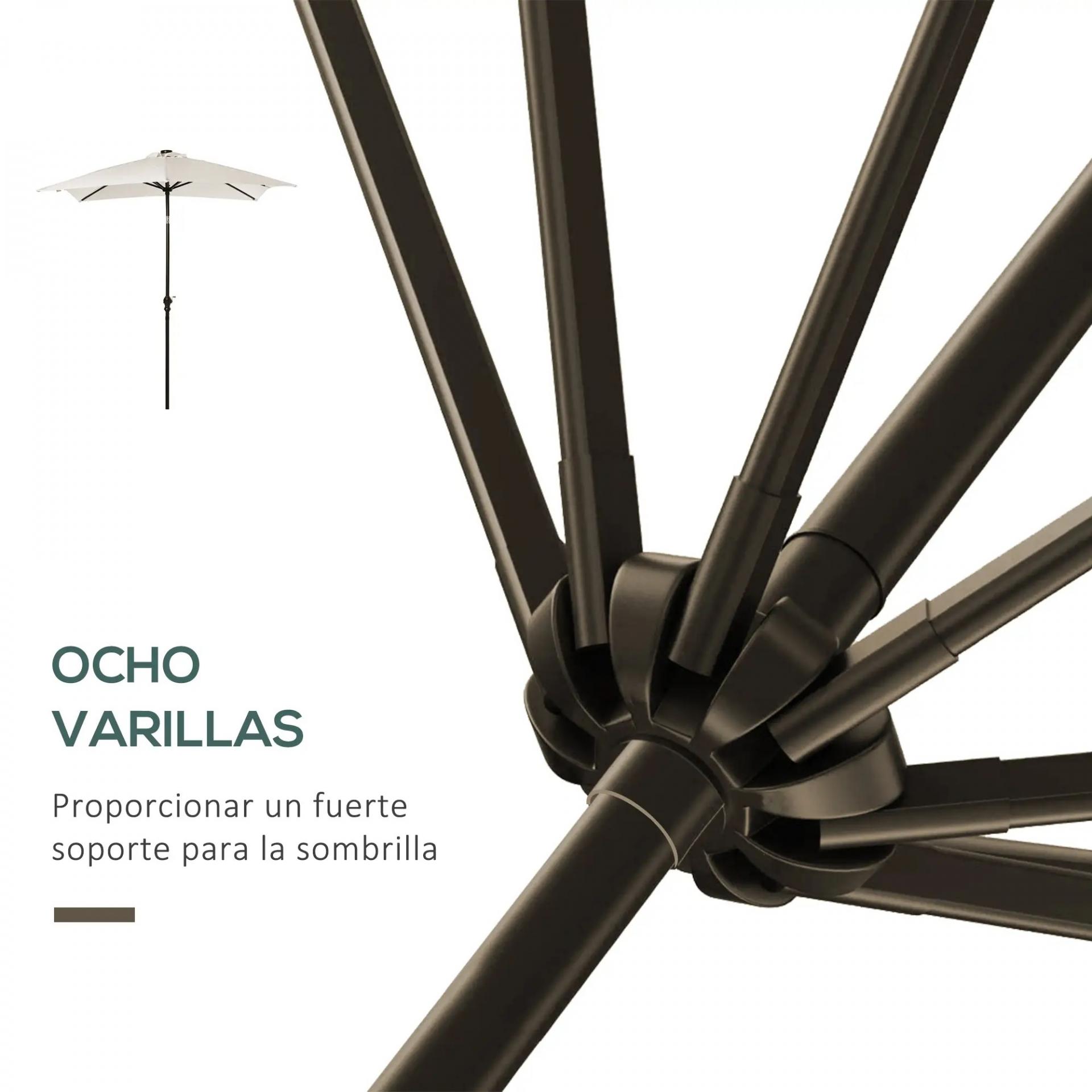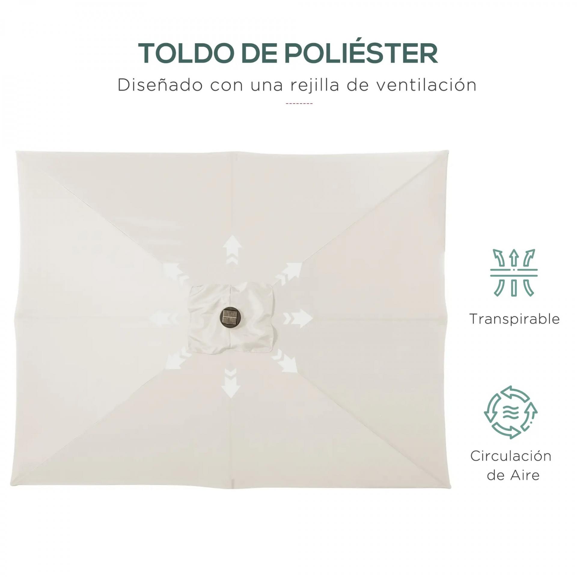 SOMBRILLA DE JARDÍN CON LUCES LED: Esta sombrilla de jardín proporciona sombra durante el día y luz por hasta 4 horas por la noche. Con 30 luces LED alimentadas por un panel solar, es perfecta para crear un ambiente acogedor en las noches al aire libre