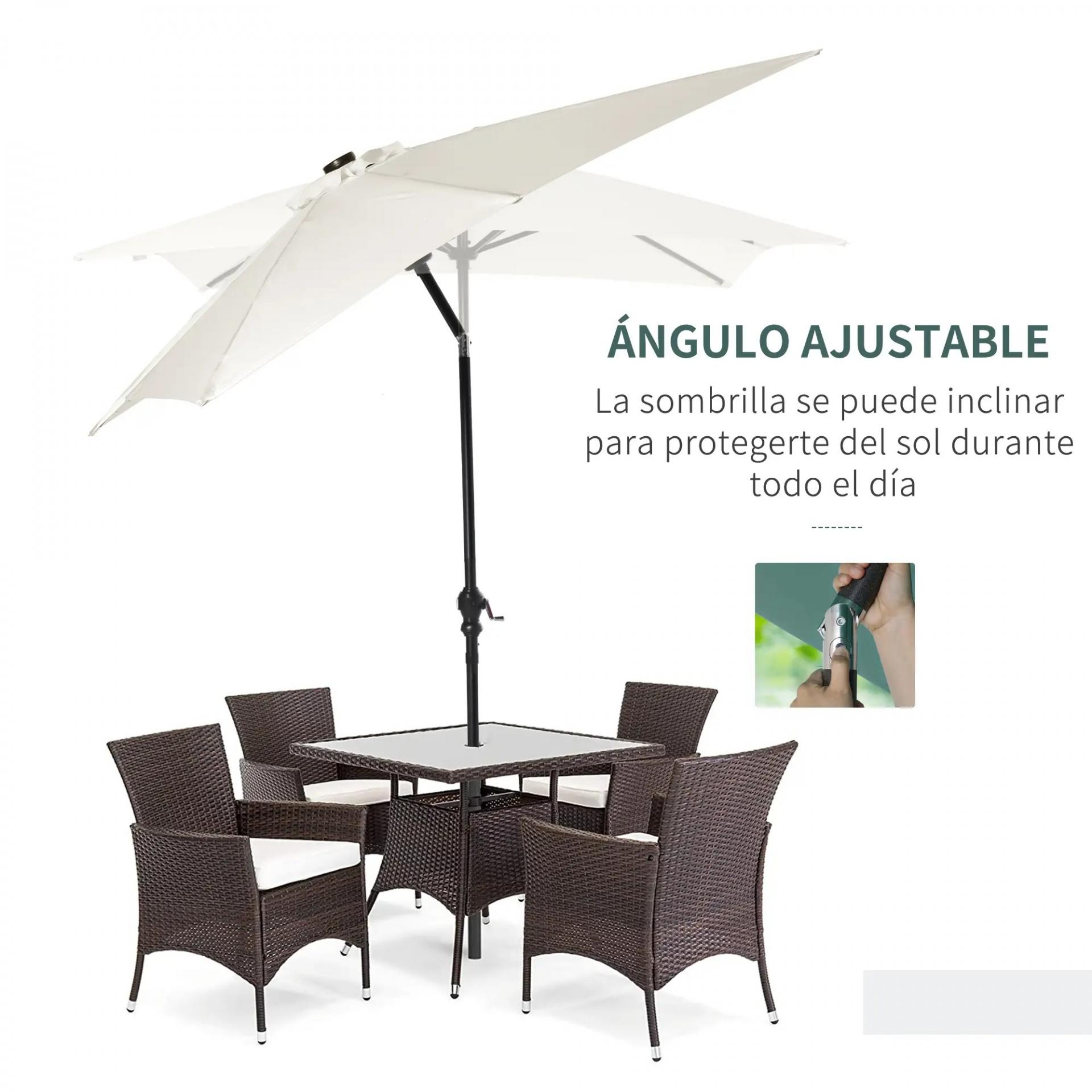 - CON MANIVELA DE INCLINACIÓN: Abre y cierra esta sombrilla de terraza mediante la manivela incorporada en el mástil. Además, tiene un ángulo de inclinación de hasta 45°, ideal para ajustar según la incidencia de los rayos solares