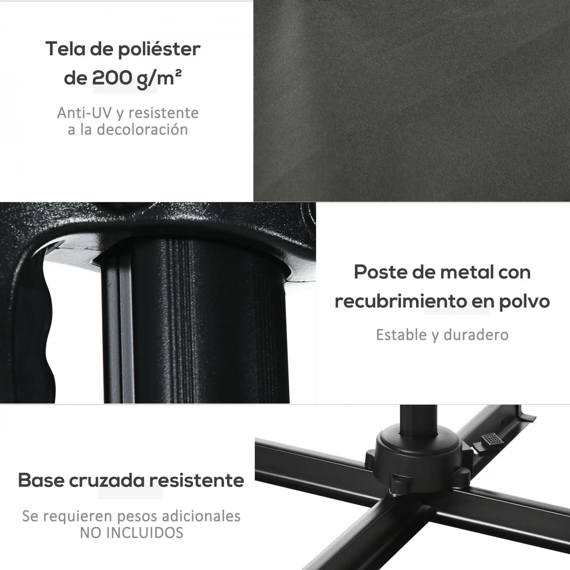 - MÁSTIL GIRATORIO DE 360°: El mástil va instalado sobre una base cruzada y cuenta con un pedal para controlar su giro de hasta 360 grados, para girar la sombrilla en todas direcciones sin necesidad de mover el soporte. Para mayor estabilidad, este parasol de terraza exterior requiere de pesos adicionales (NO incluidos)