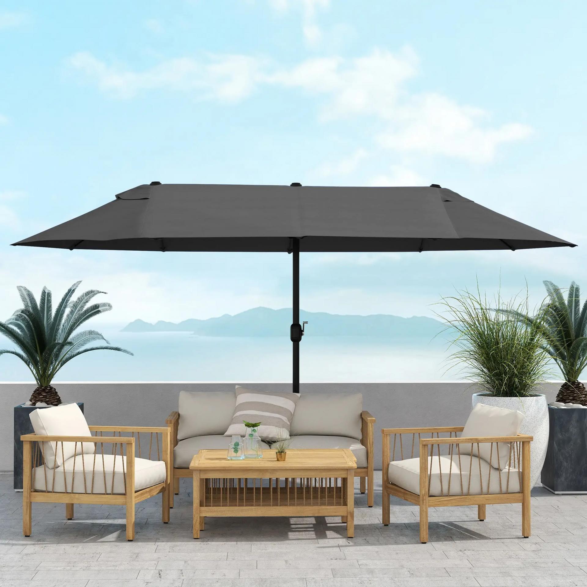 SOMBRILLA DOBLE: Esta elegante sombrilla de grandes dimensiones con una longitud de 4,55 metros y 2,38 metros de ancho, proporcionará una gran zona de sombra en cualquier espacio exterior como el jardín o terraza de tu hogar