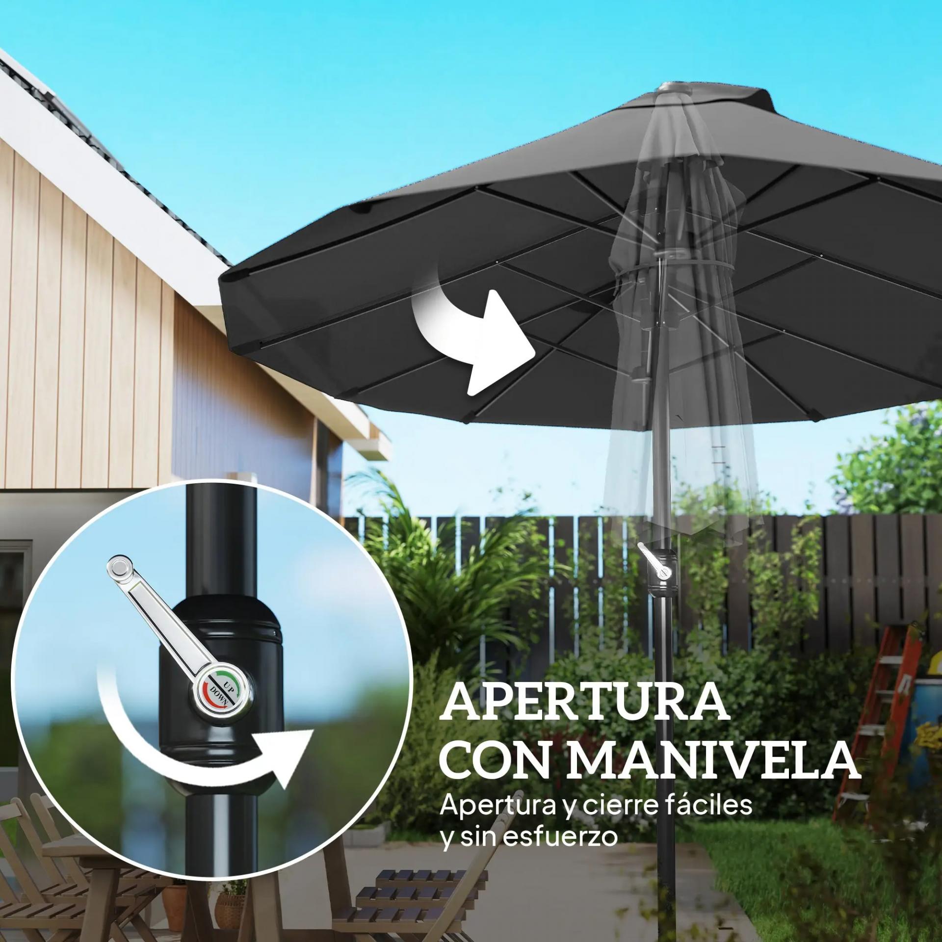 - APERTURA Y CIERRE CON MANIVELA: Sombrilla de jardín muy fácil de usar gracias a su mecanismo de apertura y cierre mediante manivela manual. La manivela está situada en el mismo mástil por lo que te será muy fácil de utilizar y regular según tus necesidades