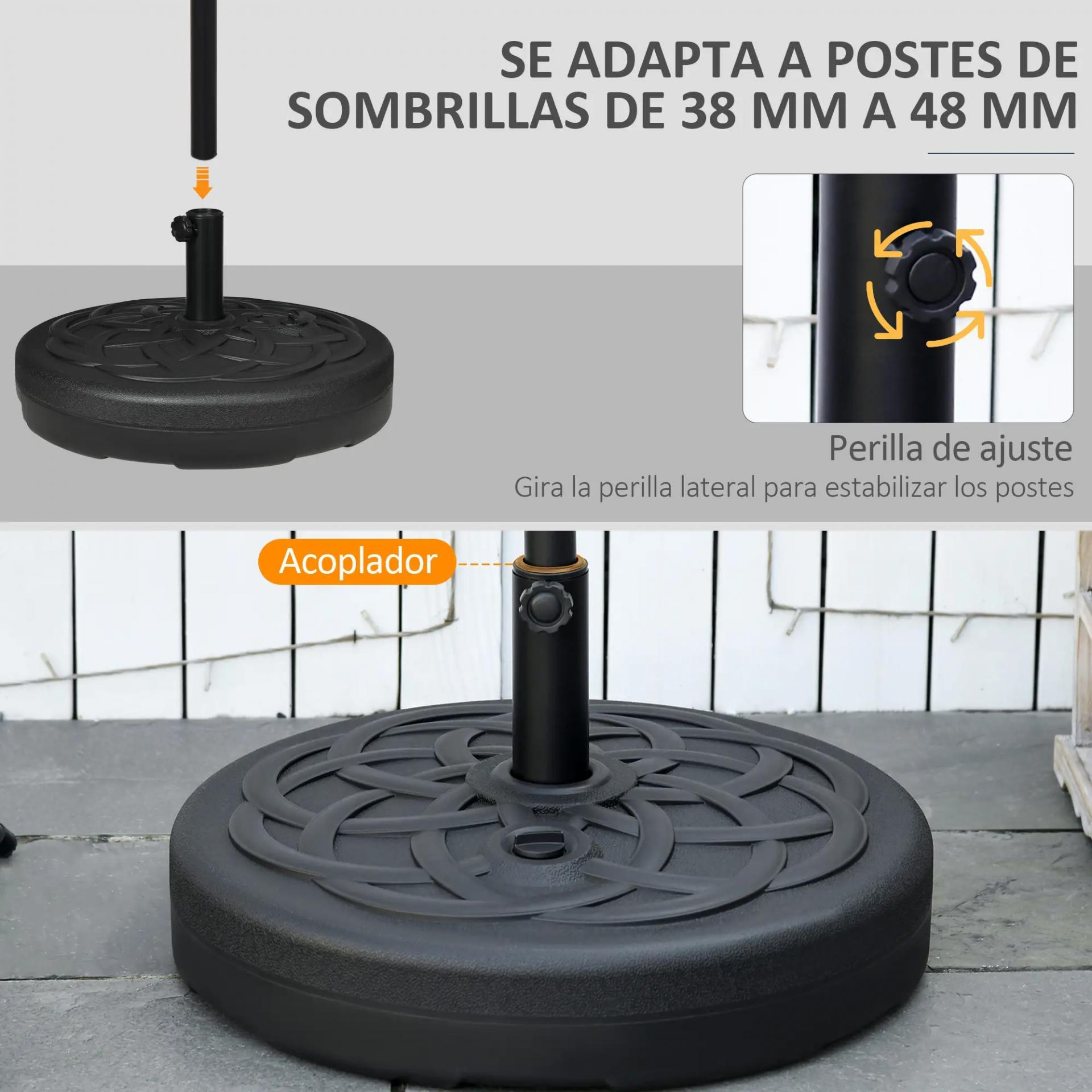 SE ADAPTA A LA MAYORÍA DE SOMBRILLAS: Esta base para sombrilla es adecuada para mástiles con diámetros de 38 mm y 48 mm. El soporte de esta base cuenta con una perilla giratoria, para ajustar más firmemente al diámetro de tu sombrilla y quede fija y estable, incluso si los postes de las sombrillas no coinciden exactamente
