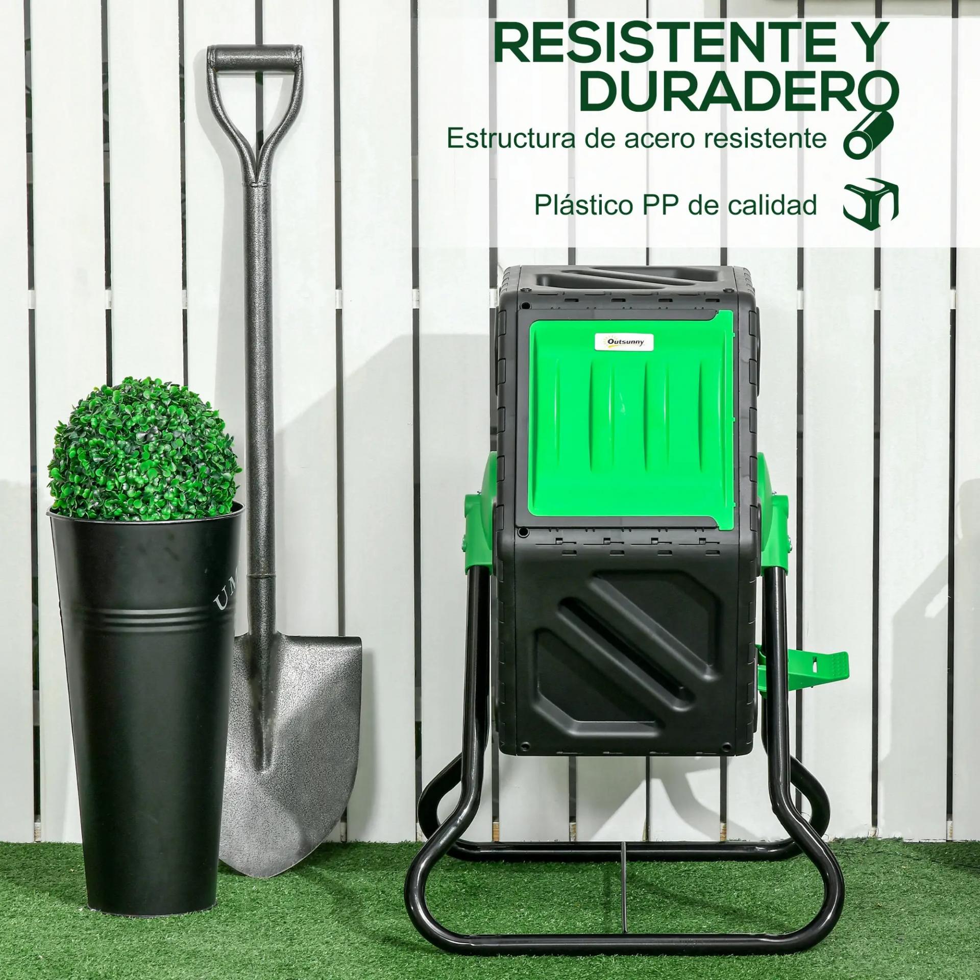- BASE DE ACERO: La base de acero ofrece una estructura resistente y estable para el compostador rotatorio, soportando de manera segura los materiales y facilitando su manejo