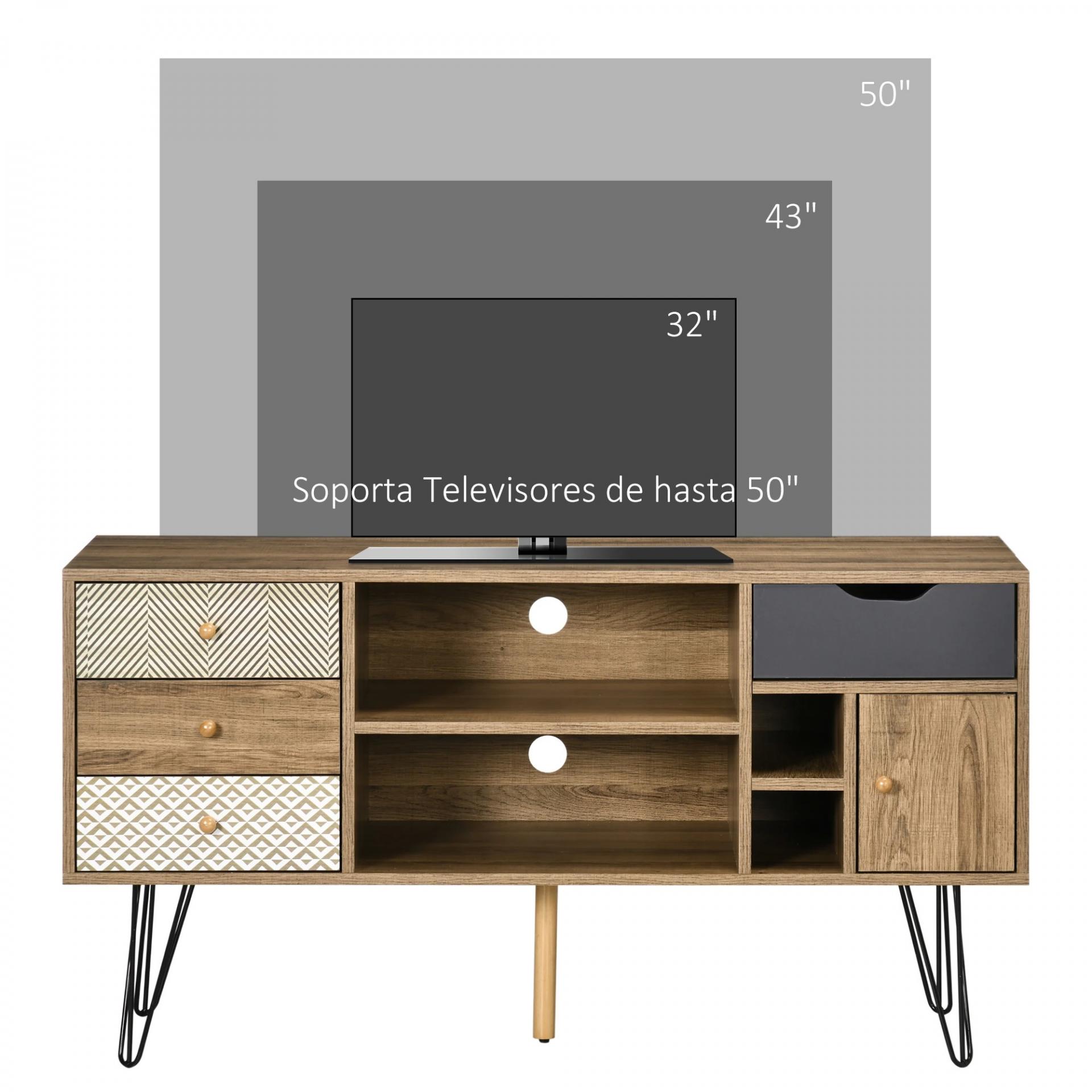 ESTILO BOHO-CHIC: Esta mesa para televisor de estilo bohemio cuenta con algún cajón cuyo frontal es de color o está estampado con forma de cenefa y patas de metal de horquilla de color negro. Gracias a su bonito y original diseño no pasará desapercibido y añadirá un toque de elegancia allá donde lo coloques. La encimera permite colocar un televisor de hasta 50"