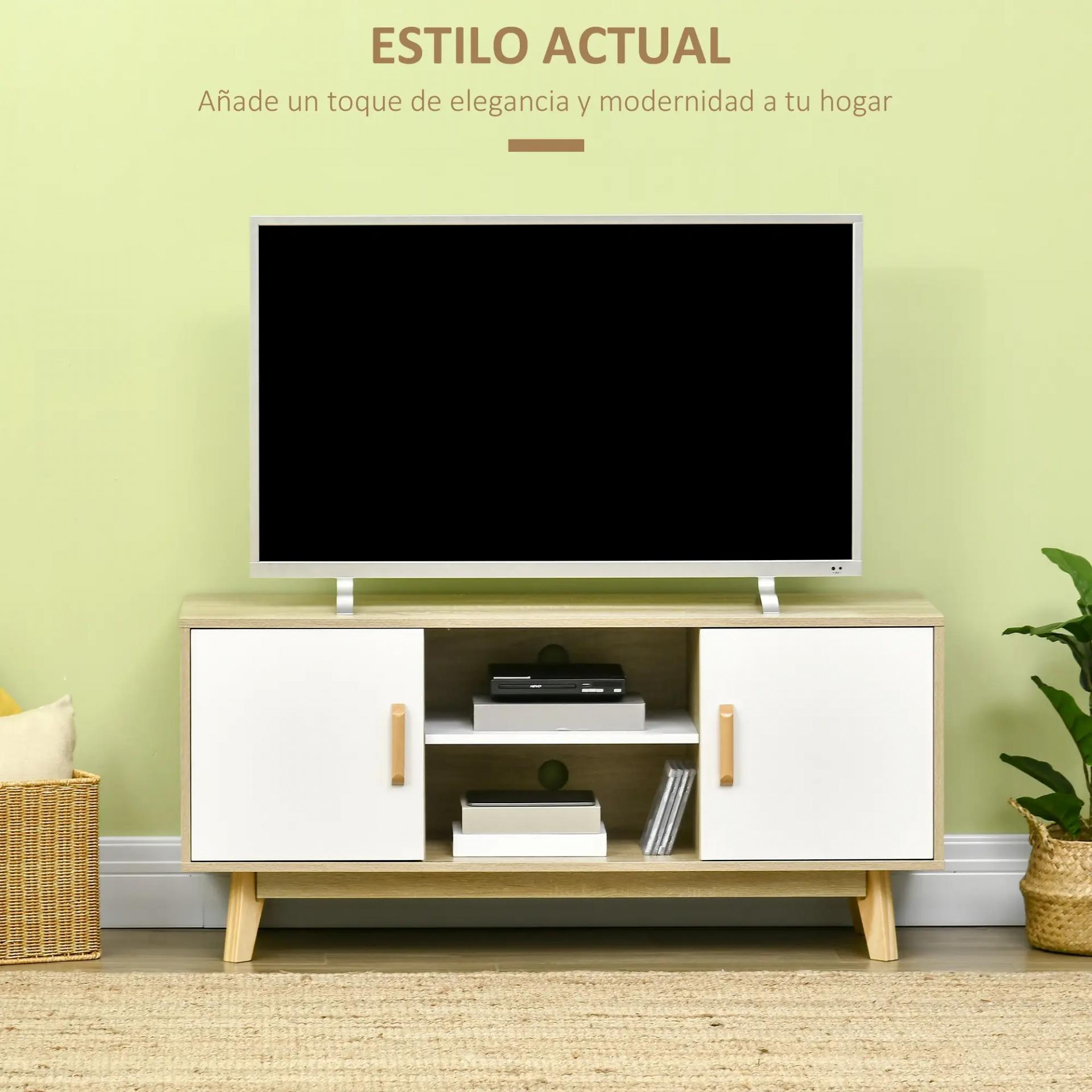 MUEBLE DE TV MINIMALISTA: Mueble de TV apto para televisores de hasta 55". Gracias a su estilo minimalista y a la combinación de colores en blanco y madera, este mueble combinará fácilmente con el resto de la decoración de tu hogar y mobiliario