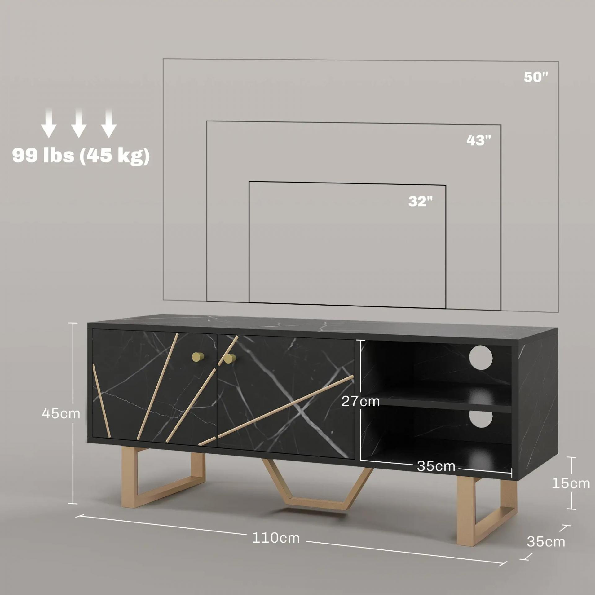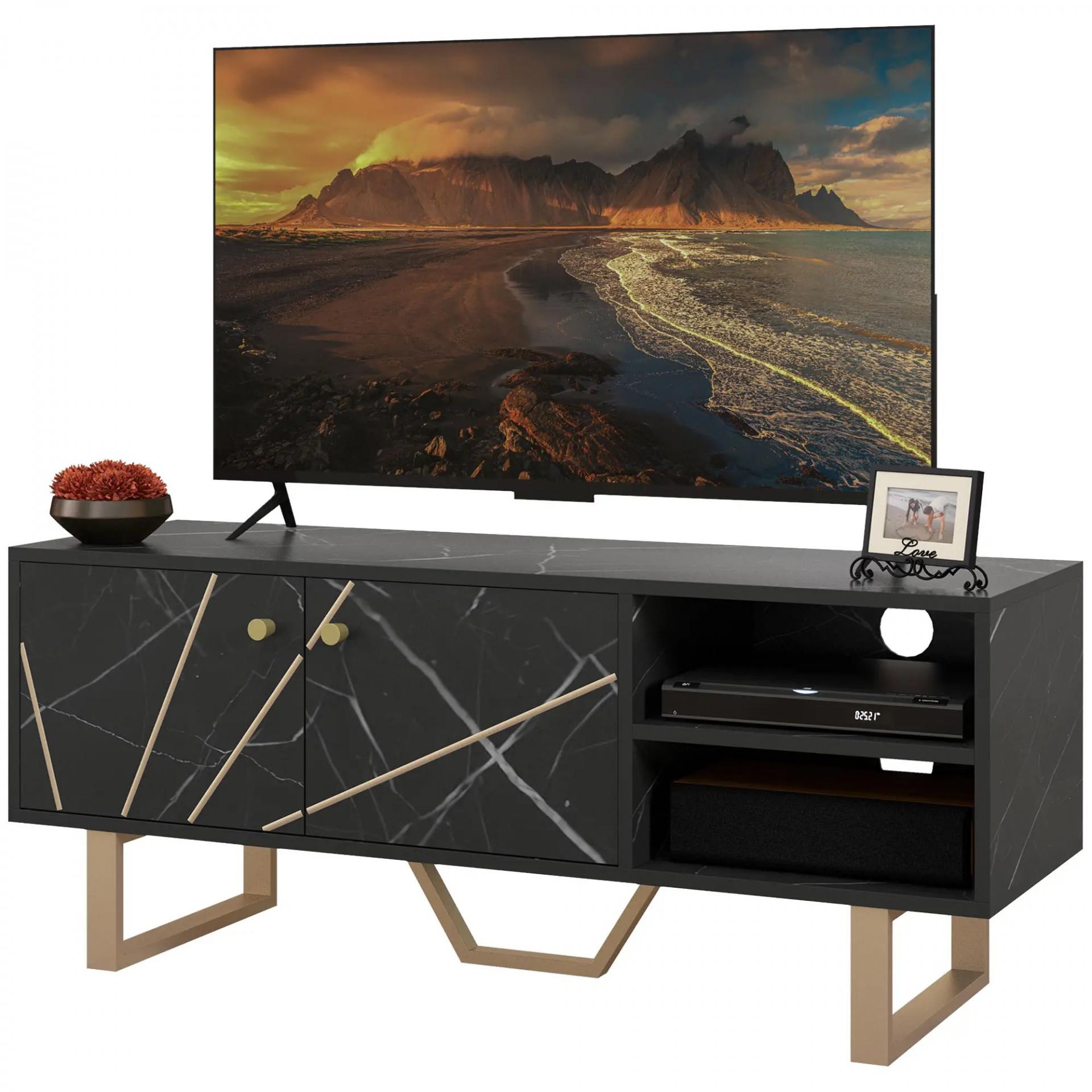 MUEBLE DE TV ELEGANTE Y MODERNO: Este mueble para tu televisor de hasta 50 pulgadas no solo añadirá un toque de elegancia a tu comedor o sala de estar, sino que también aportará un aire renovado a tu hogar. Y eso gracias a su acabado en efecto mármol negro, salpicado de sutiles pinceladas doradas y blanco y las patas y los pomos en tono dorado