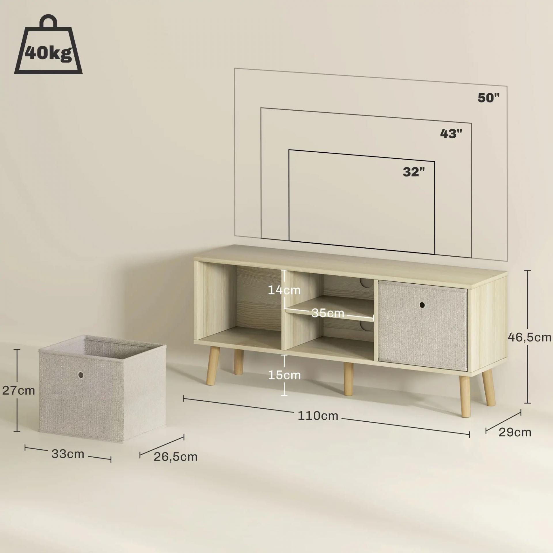 MEDIDAS TOTALES: 110x29x46,5 cm (LxANxAL). Peso máximo soportado: 40 kg (total), 3 kg (cajón) y 5 kg (estante). Apto para televisores de hasta 50 pulgadas