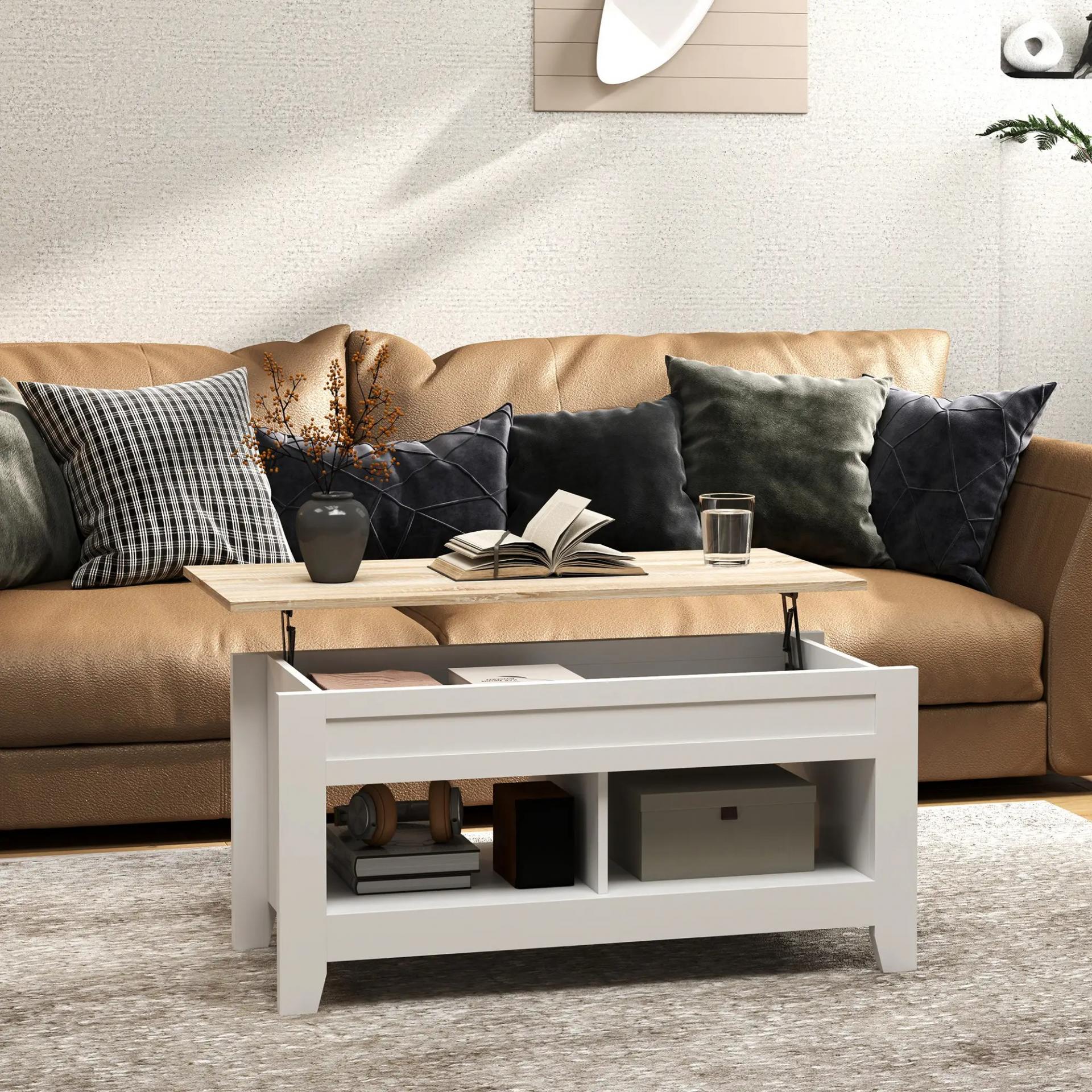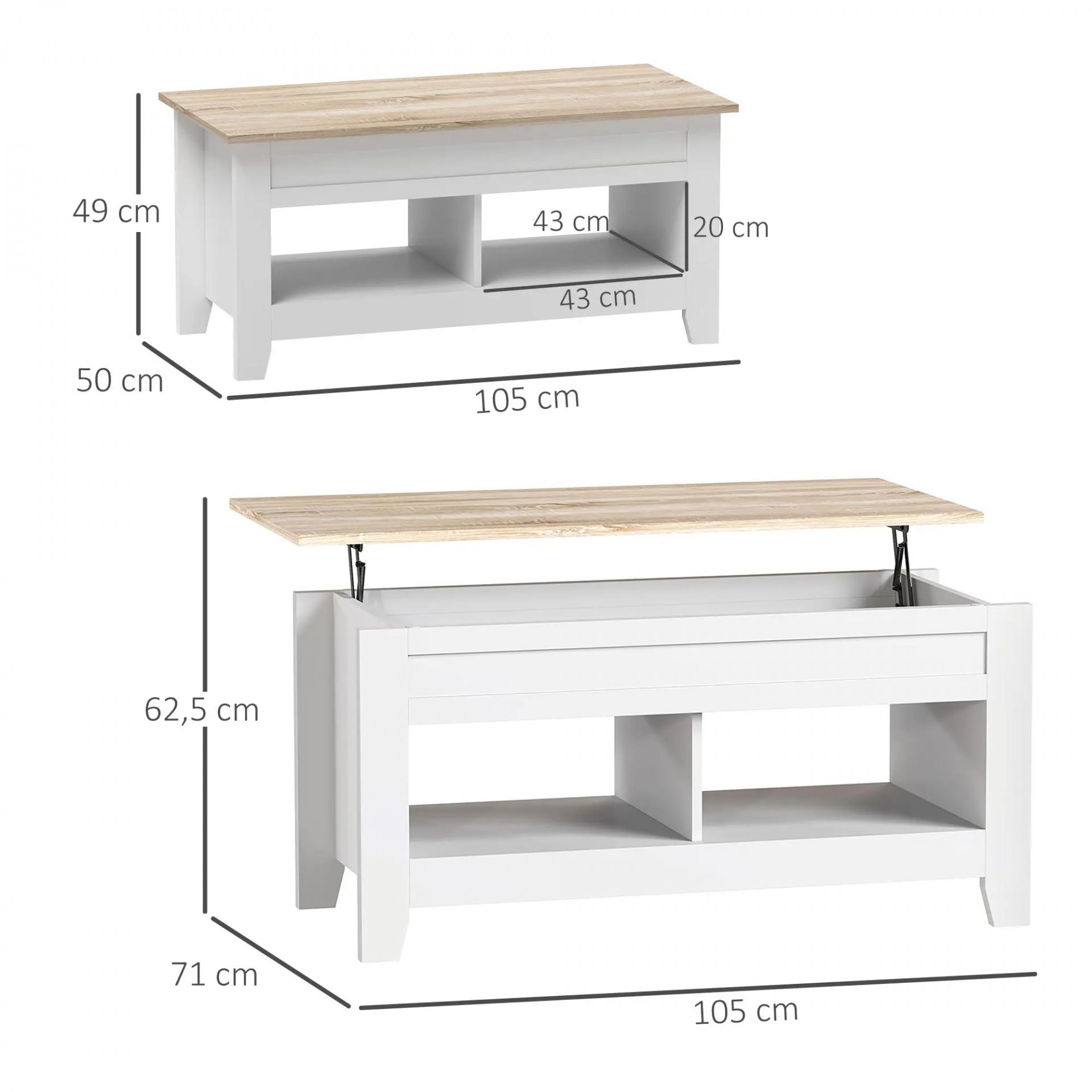 Mesa de Centro Elevable con Encimera Elevable y Espacio Oculto de Almacenaje 105x50x49 cm Blanco y Natural