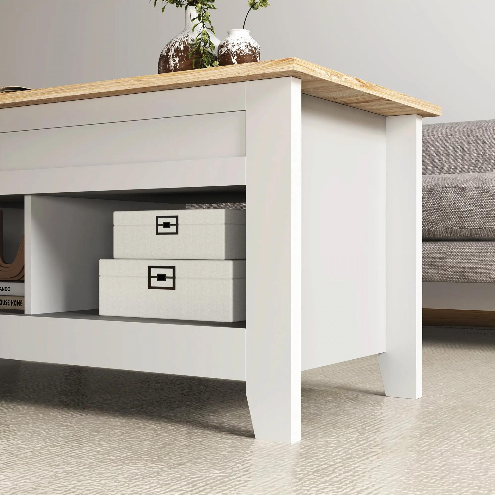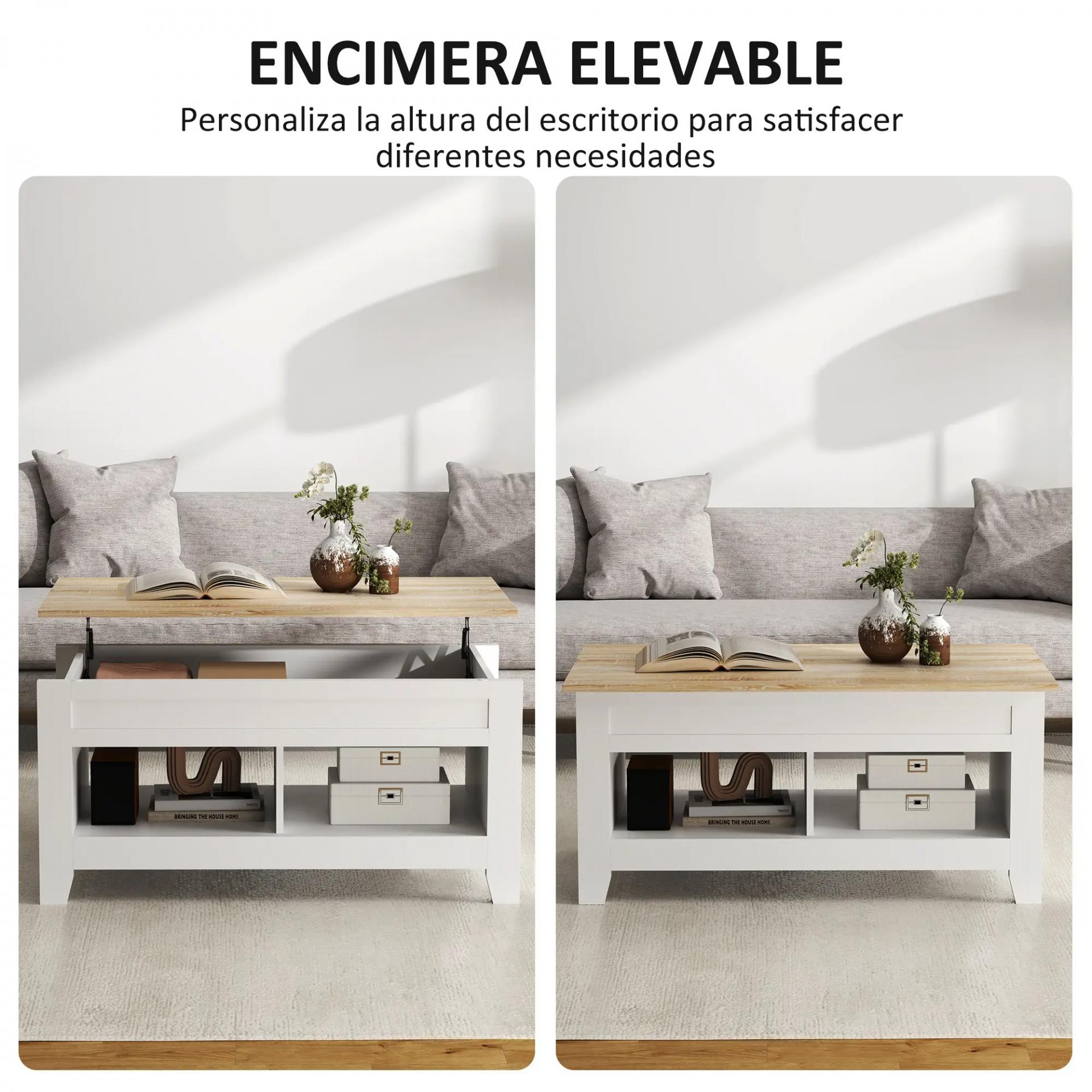 DISEÑO CON ENCIMERA ELEVABLE: La encimera de esta moderna mesa de centro elevable se puede levantar para crear una superficie de trabajo. La combinación de colores blanco y madera se integrará perfectamente con el resto de la decoración de tu hogar