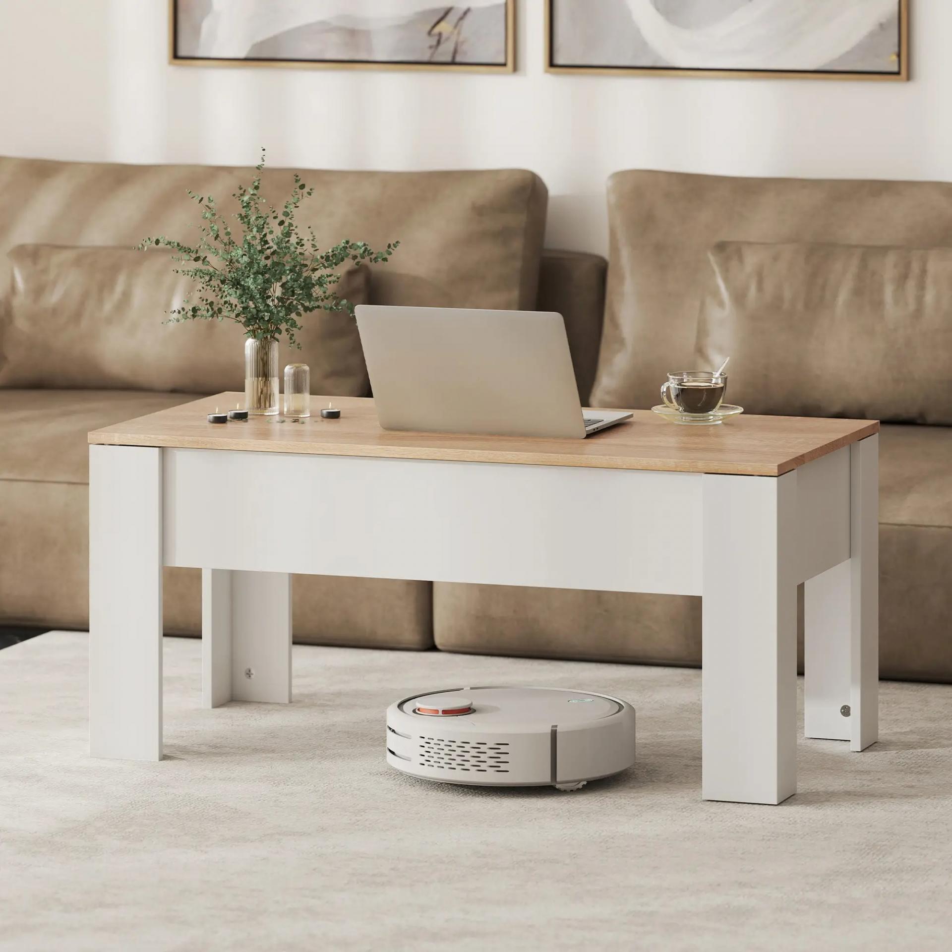 Mesa de Centro Elevable con Encimera Elevable con Espacio Oculto de Almacenaje 100x50x45-58,5 cm Blanco y Natural