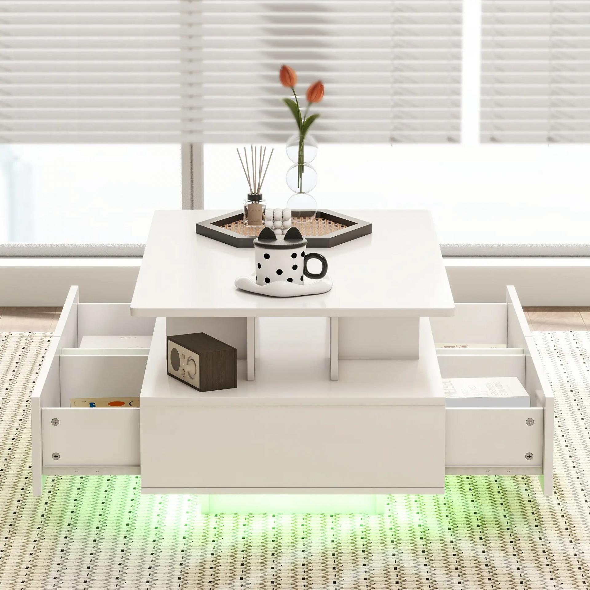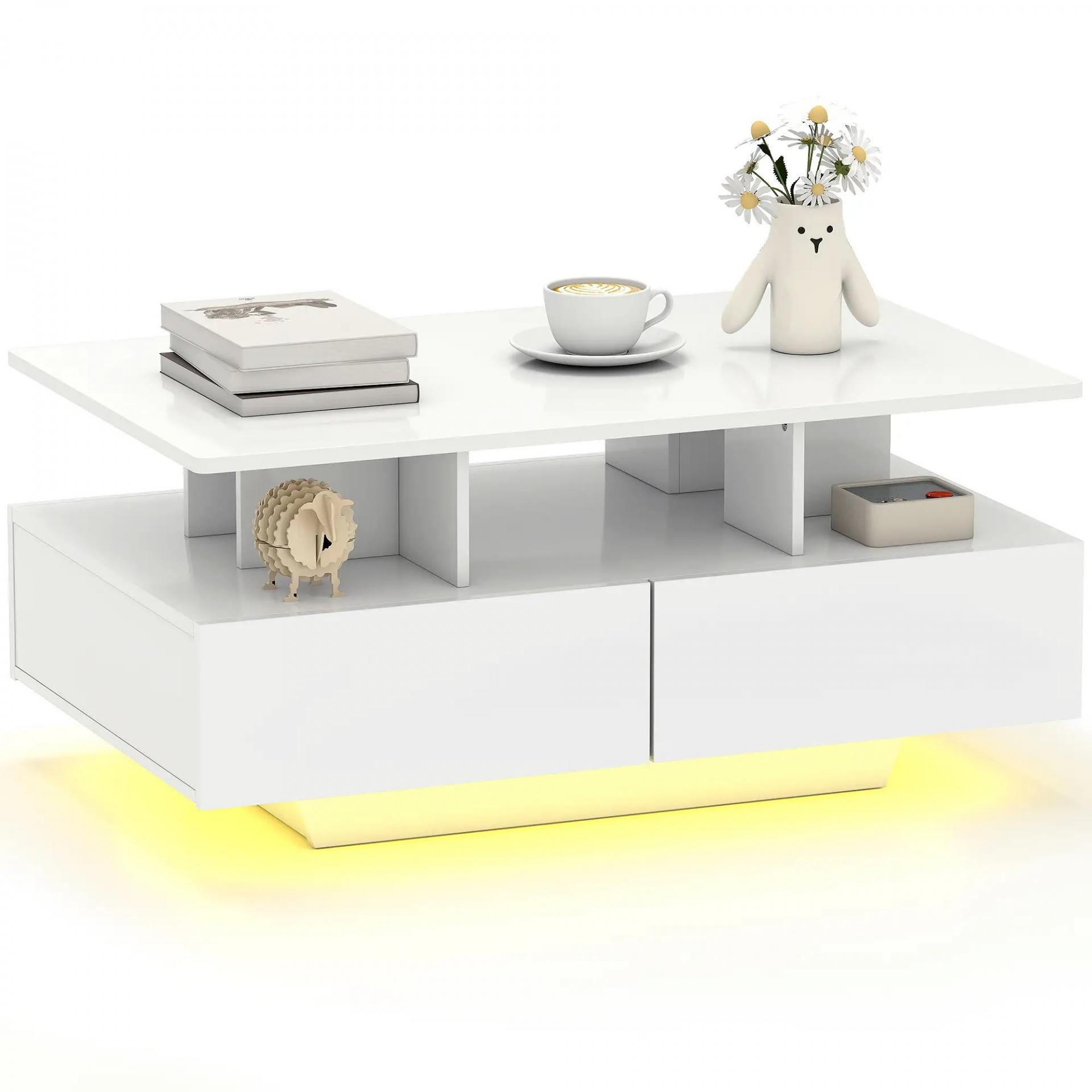 Mesa de Centro LED Moderna con 4 Cajones Estante Abierto y Luces LED de 16 Colores para Salón 90x55x41 cm Blanco Brillo