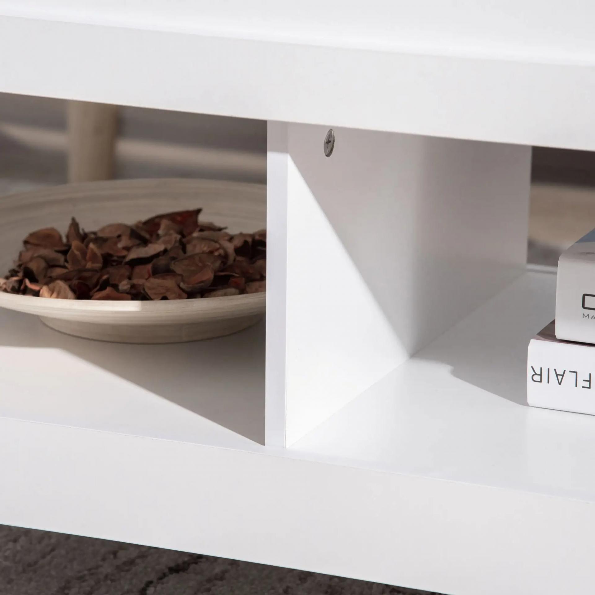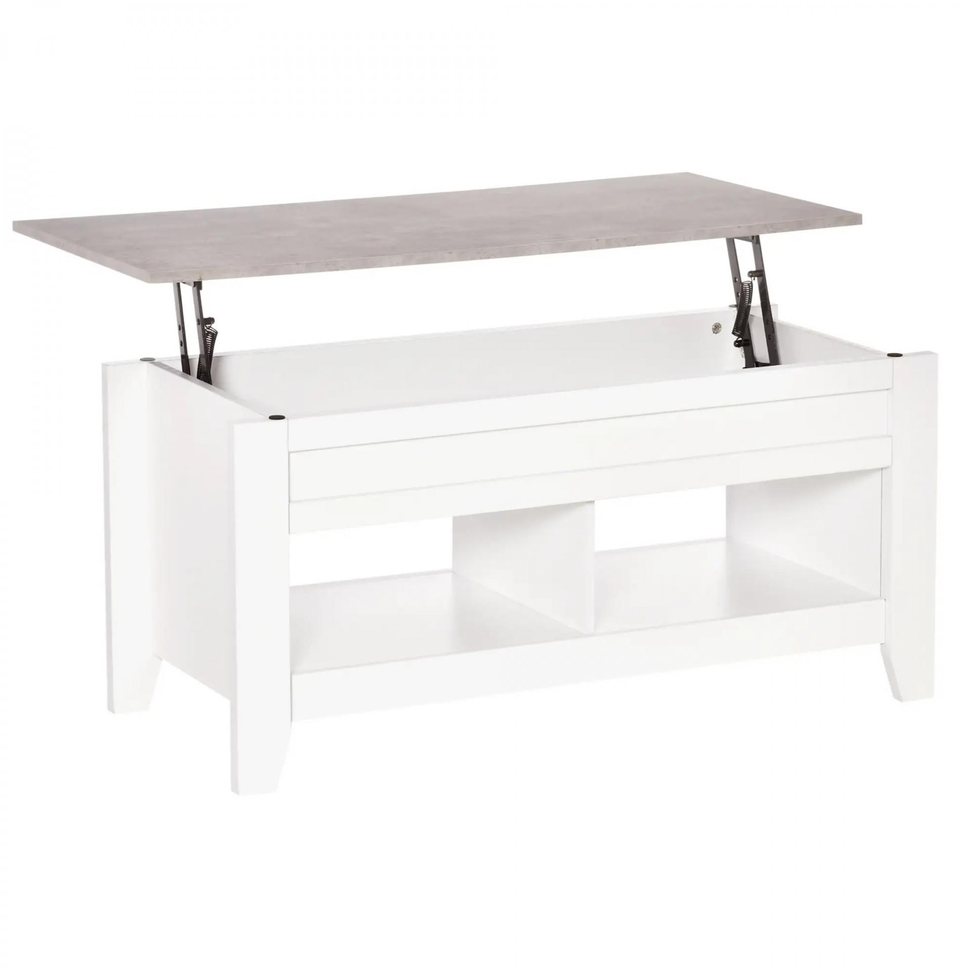 DISEÑO CON ENCIMERA ELEVABLE: La encimera de esta moderna mesa de centro elevable se puede levantar para crear una superficie de trabajo. La combinación de colores blanco y madera se integrará perfectamente con el resto de la decoración de tu hogar