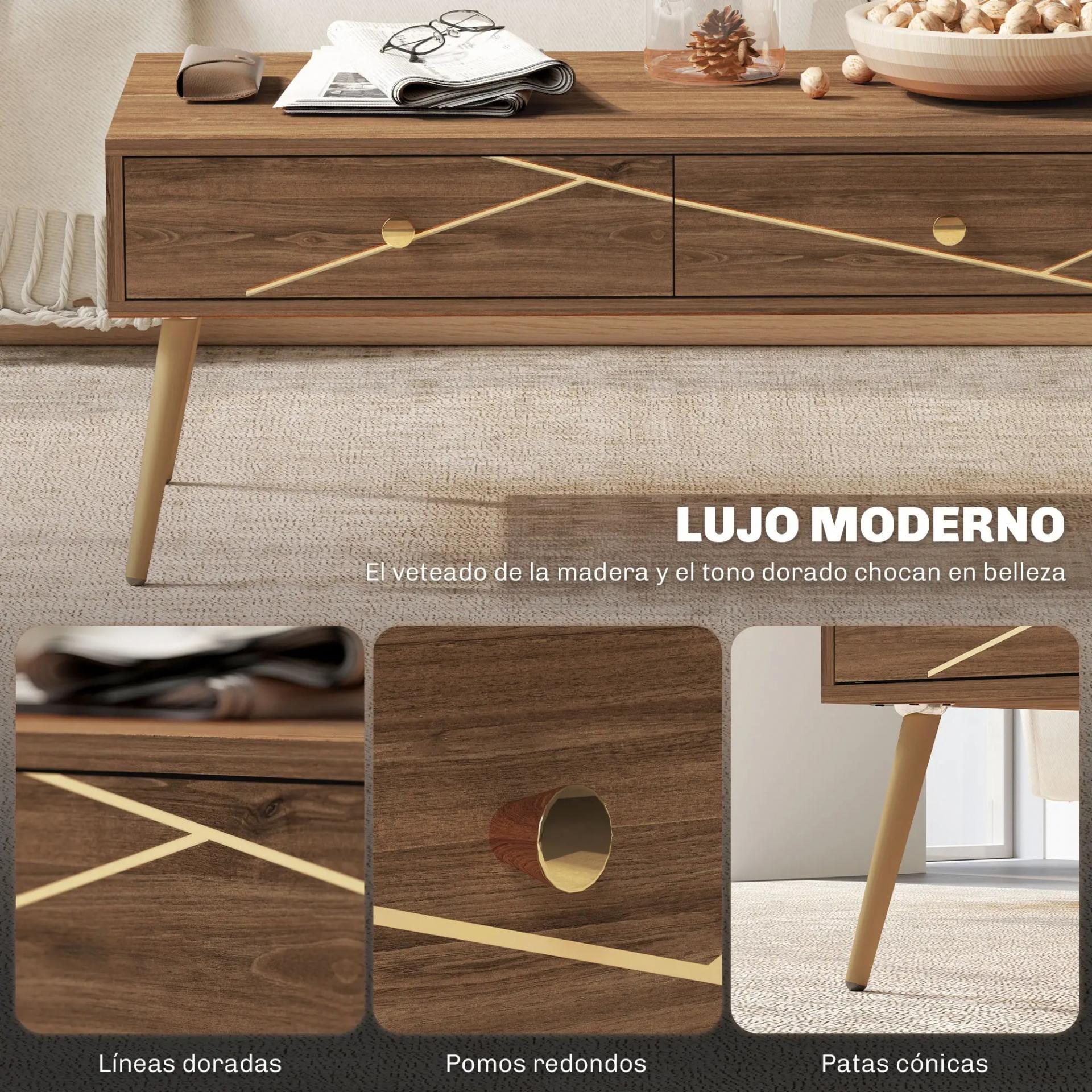 ESTILO ELEGANTE: Esta mesa de centro cuenta con paneles de melamina que simulan las vetas de la madera y detalles dorados, junto con tiradores y patas elegantes. Su estilo combinará con cualquier decoración, añadiendo un toque especial a tu sala