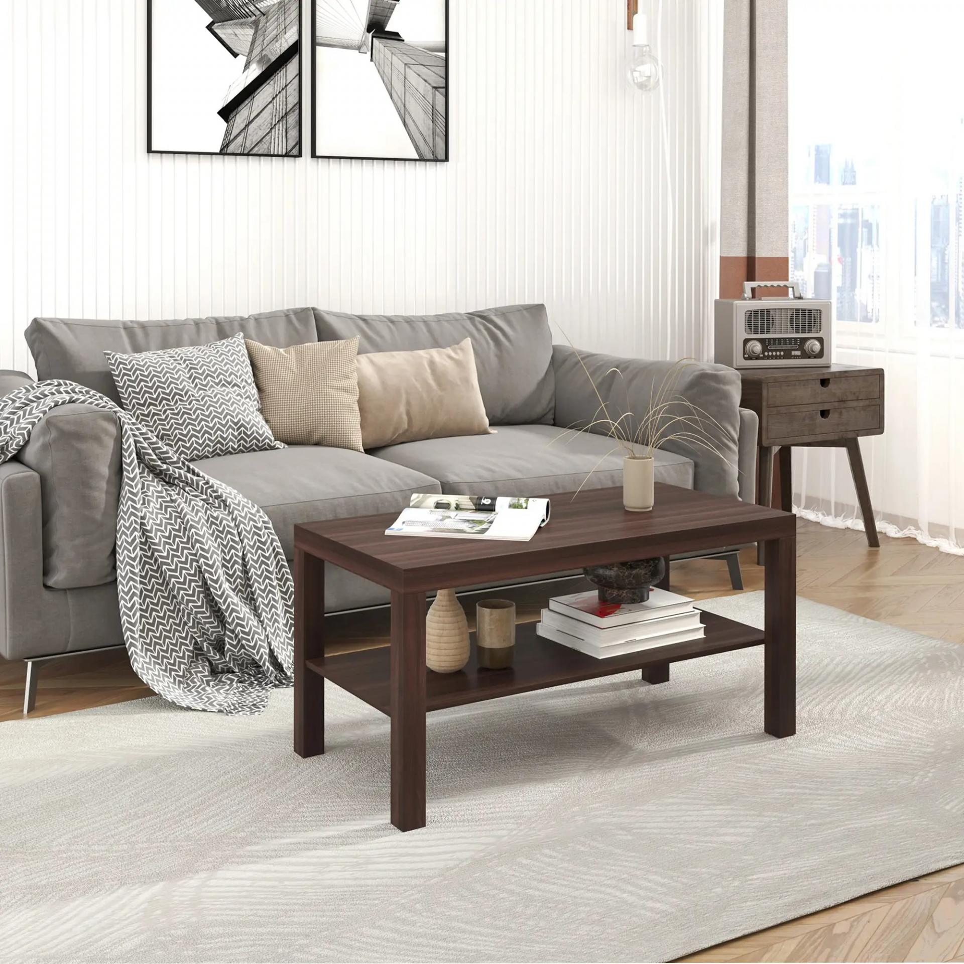 Mesa de Centro Moderna Mesa Baja con 2 Estantes de Almacenamiento Mesita para Salón Carga 20 kg 90x45x44,5 cm Nogal
