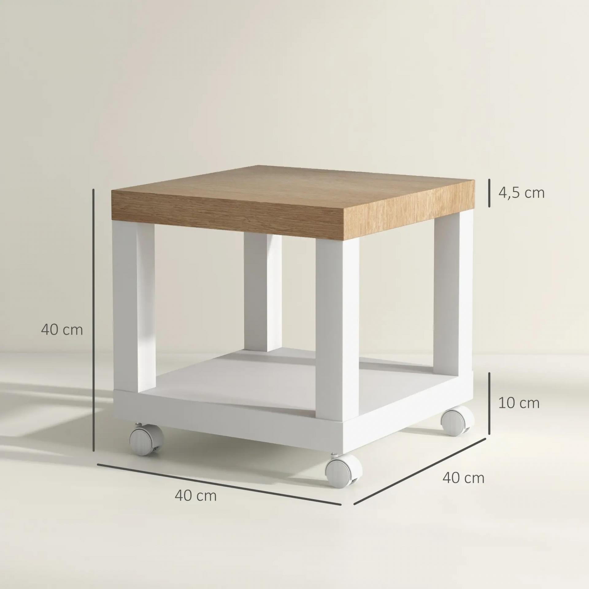 MESITA CUADRADA CON RUEDAS: Esta mesita auxiliar pequeña cuenta con patas blancas y un tablero de madera natural, aportando un diseño moderno y actual. Su acabado refinado y la combinación de colores hacen que se integre perfectamente en diversos estilos de decoración, desde el salón hasta el dormitorio
