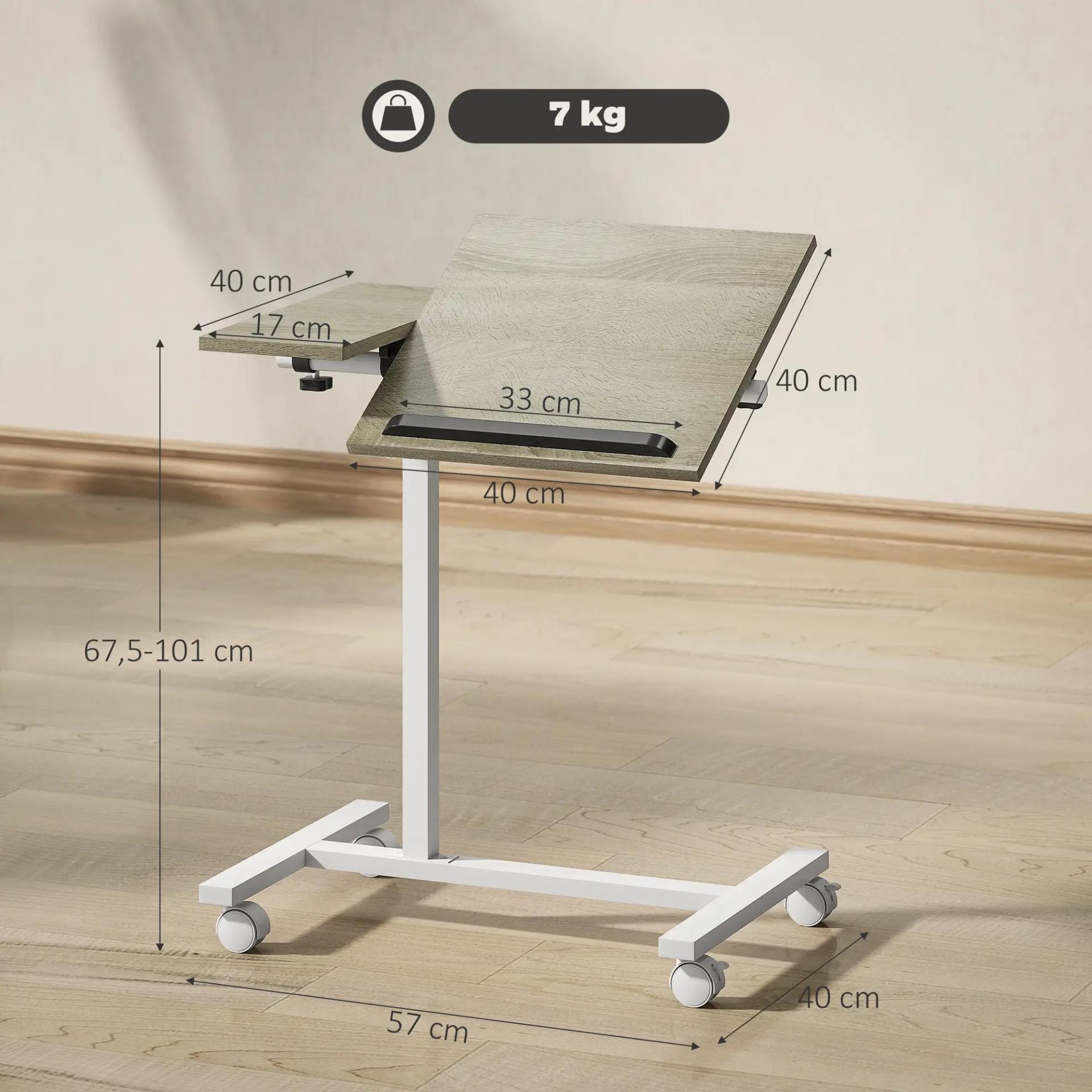 Mesa Auxiliar con Ruedas Altura Ajustable Superficie Inclinable y Marco de Metal 57x40x67,5-101 cm Roble y Blanco