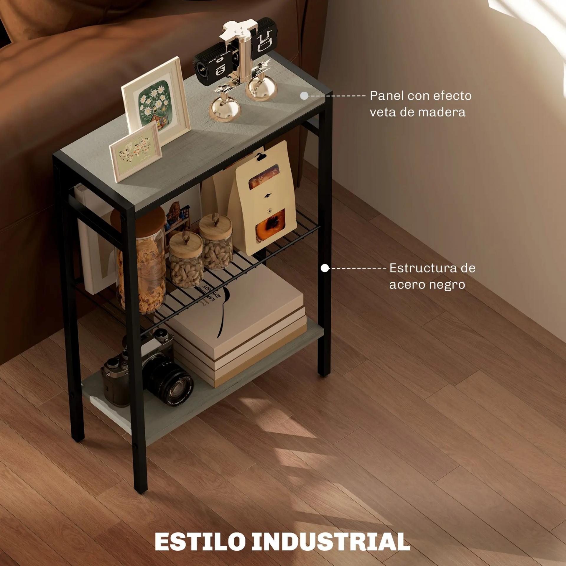 TRES ESTANTES: Esta mesa auxiliar de estilo industrial cuenta con tres estantes ideales para organizar o exponer libros, cajas y objetos decorativos. Además, el estante central tiene un panel posterior que evita caídas