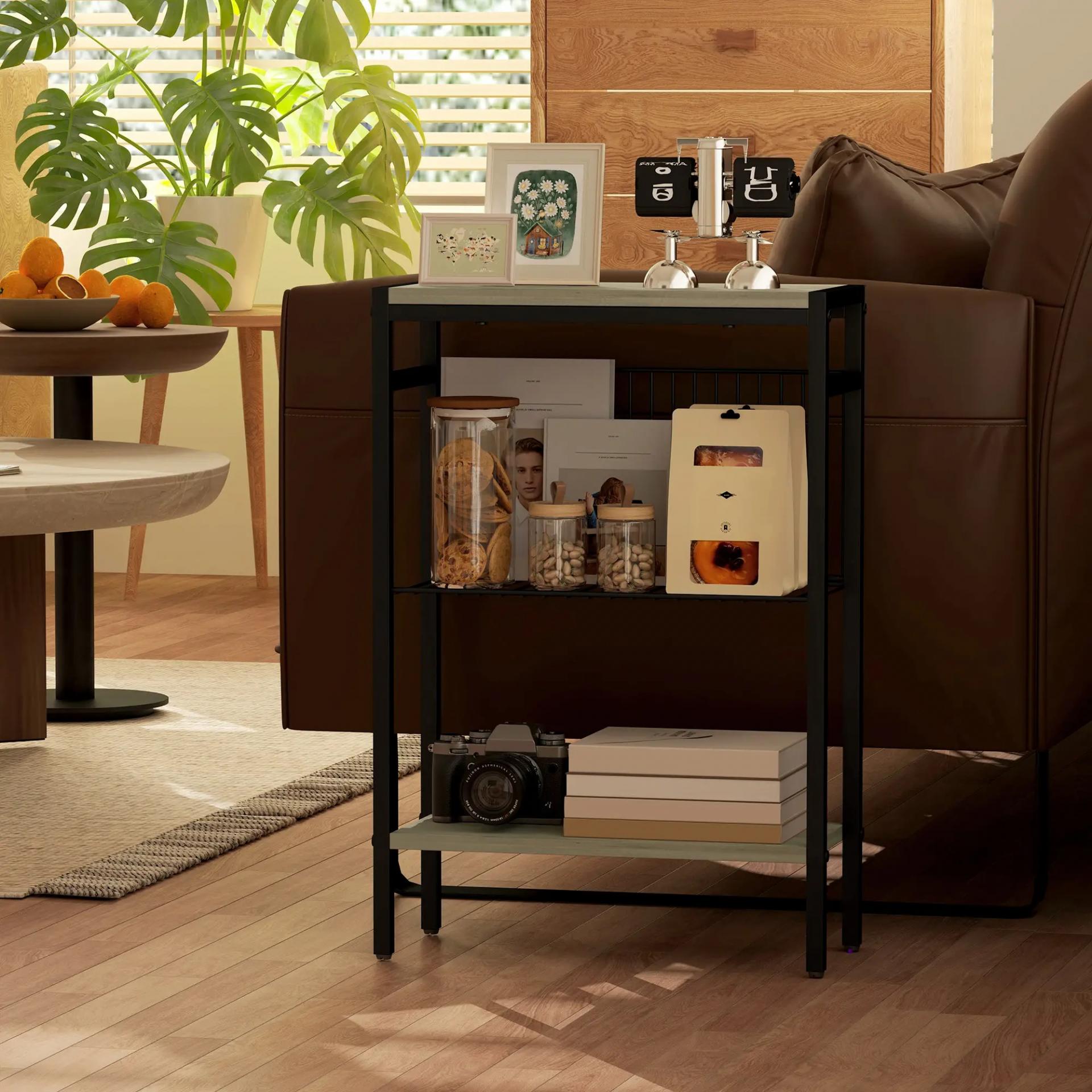 Mesa Auxiliar Estrecha de 3 Niveles con Estantes Abiertos y Estructura de Acero para Salón Dormitorio 43x18x62,5cm Gris