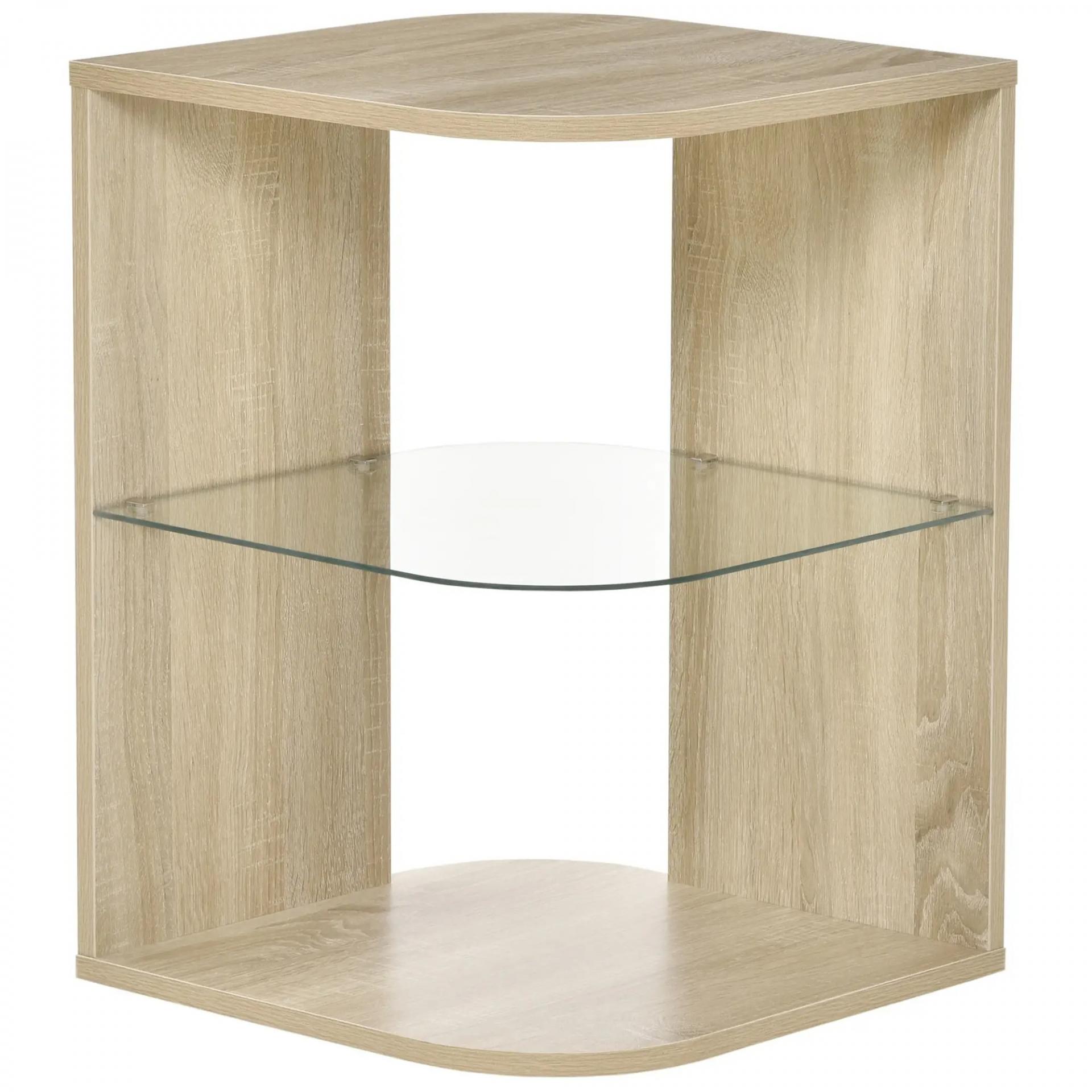 Mesita Auxiliar de Salón Moderna Mesilla de Noche con 3 Estantes Tablero de Cristal Mesita de Café para Sala de Estar Dormitorio 40x40x56 cm Madera Natural