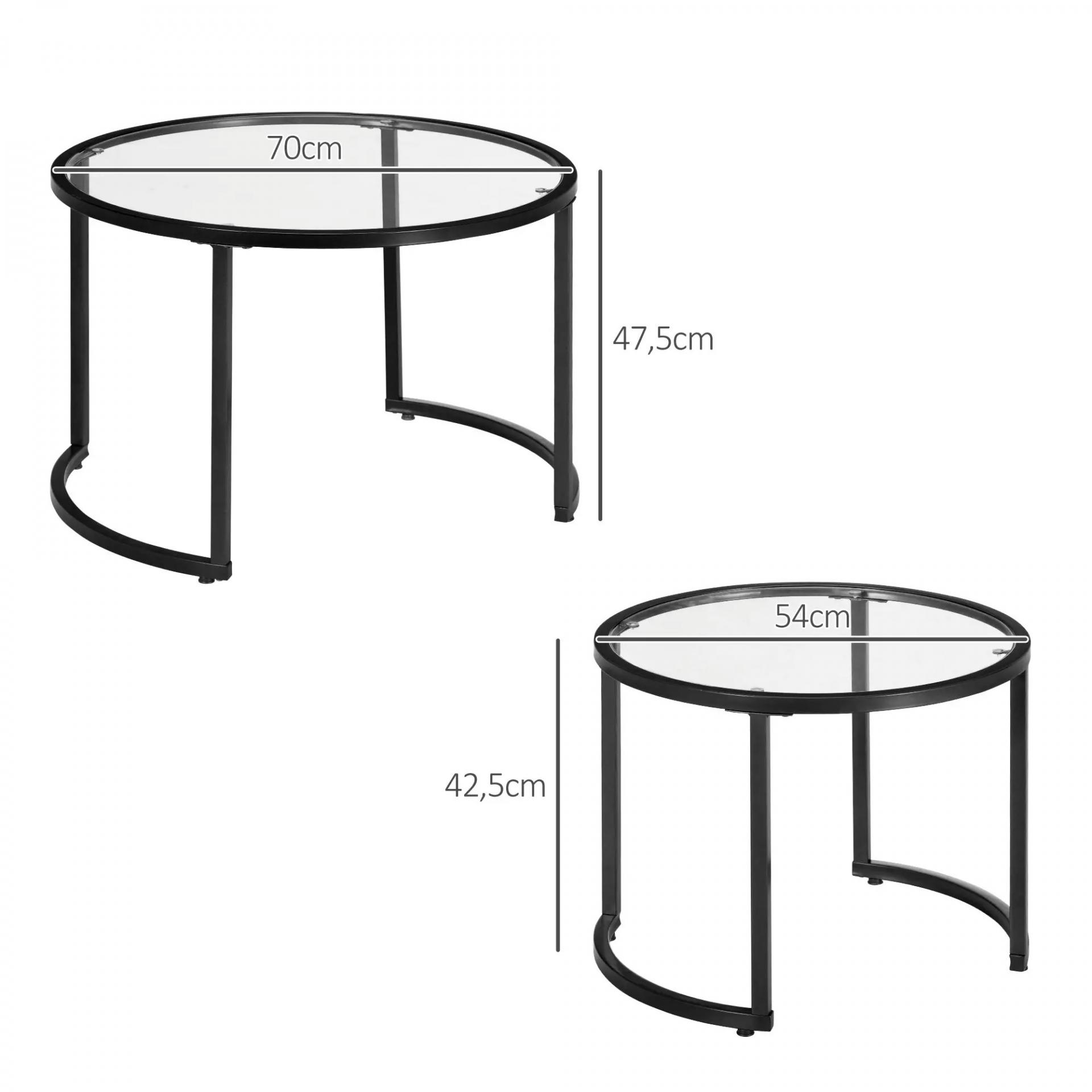 MEDIDAS TOTALES: Mesa grande: Ø70x47,5 cm. Mesa pequeña: Ø54x42,5 cm. Grosor del cristal: 5 mm. Carga máxima: 25 kg (grande), 15 kg (pequeña). Estas mesas de centro redondas requieren montaje sencillo