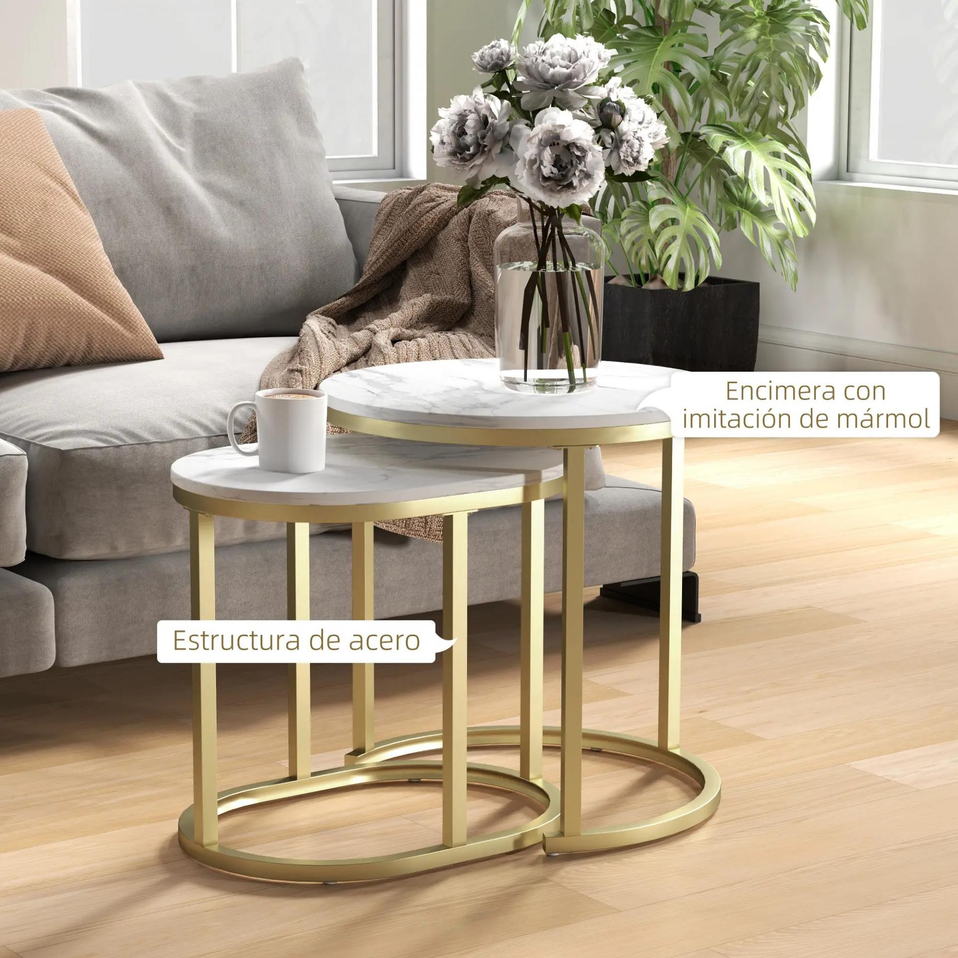 Juego de 2 Mesas de Centro Mesitas Auxiliares Tablero con Efecto Mármol Marco de Acero Dorado