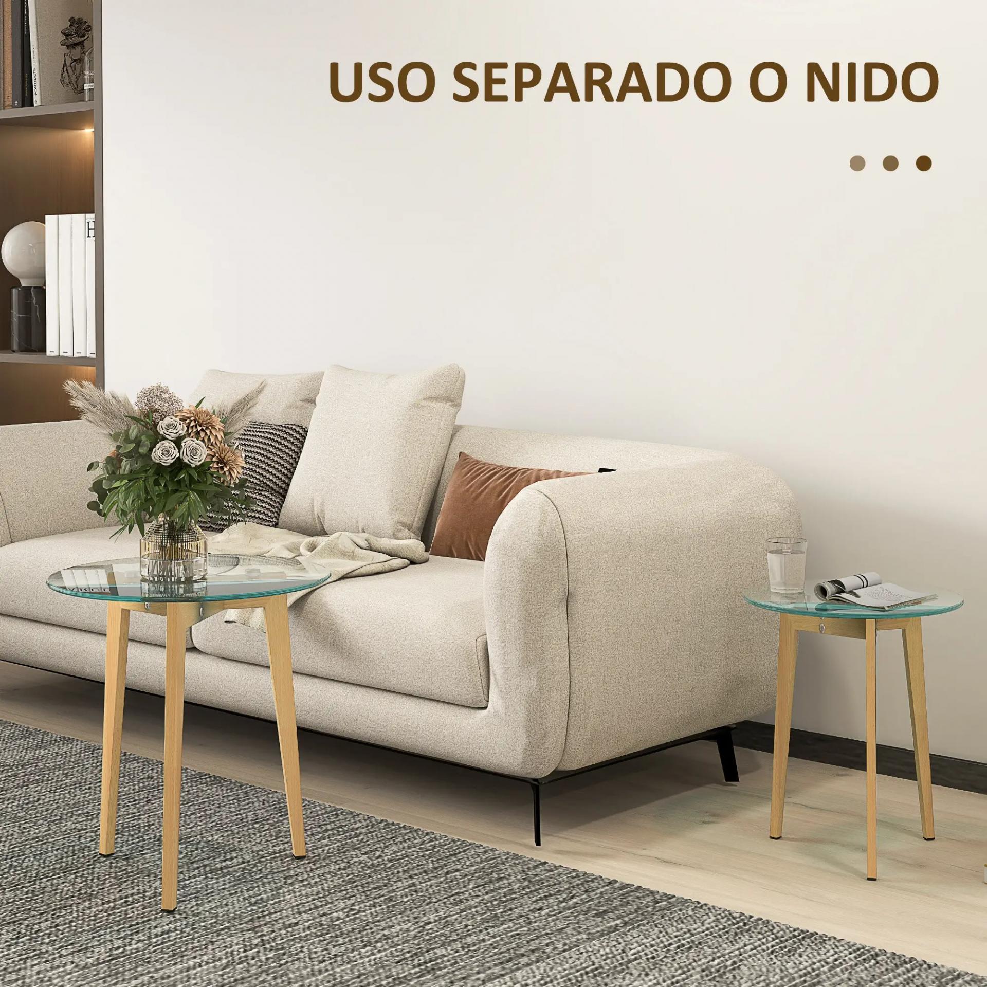 Set de 2 Mesas Auxiliares Modernas de Ø50x45 cm y Ø40x40 cm con Encimera de Vidrio Templado y Estructura de Acero