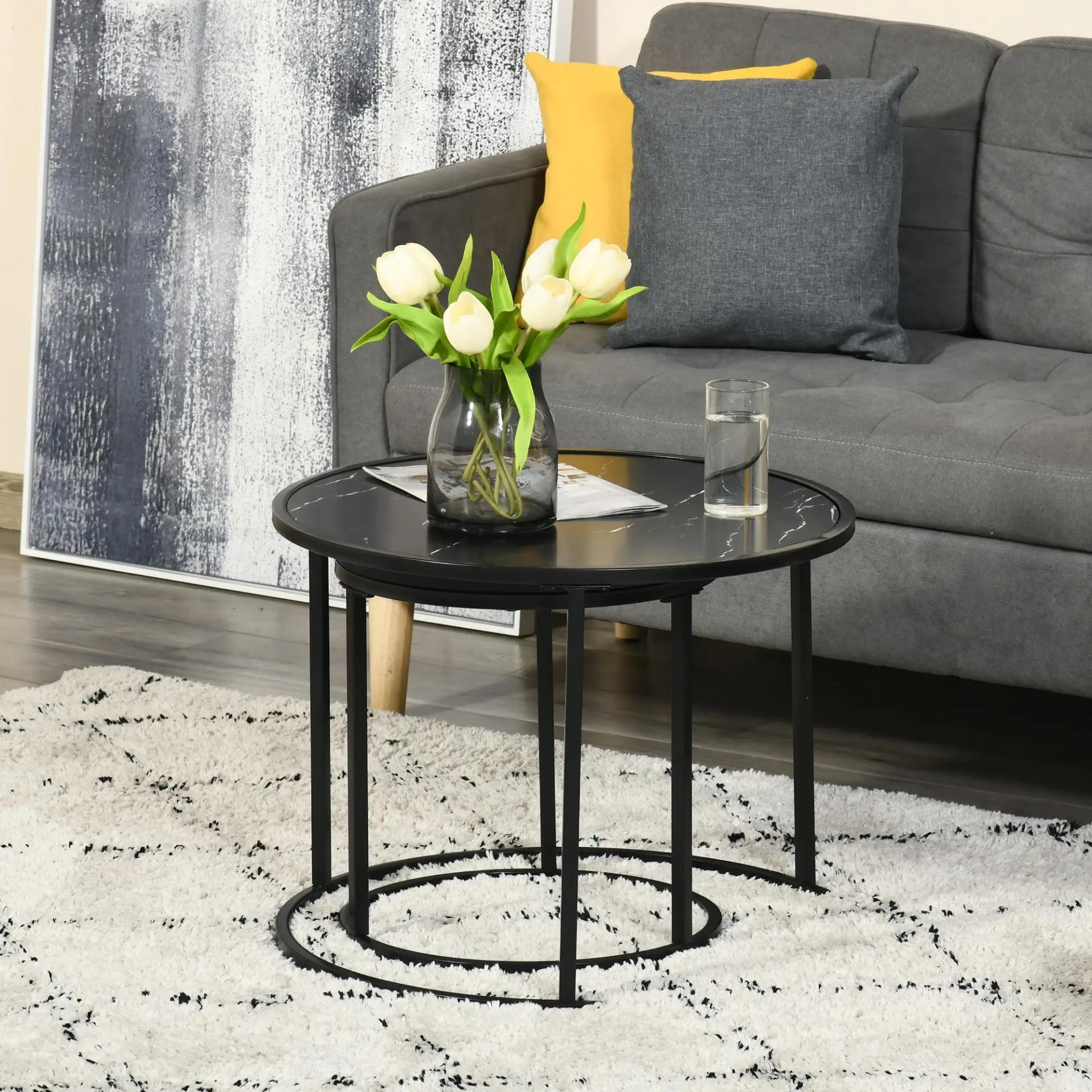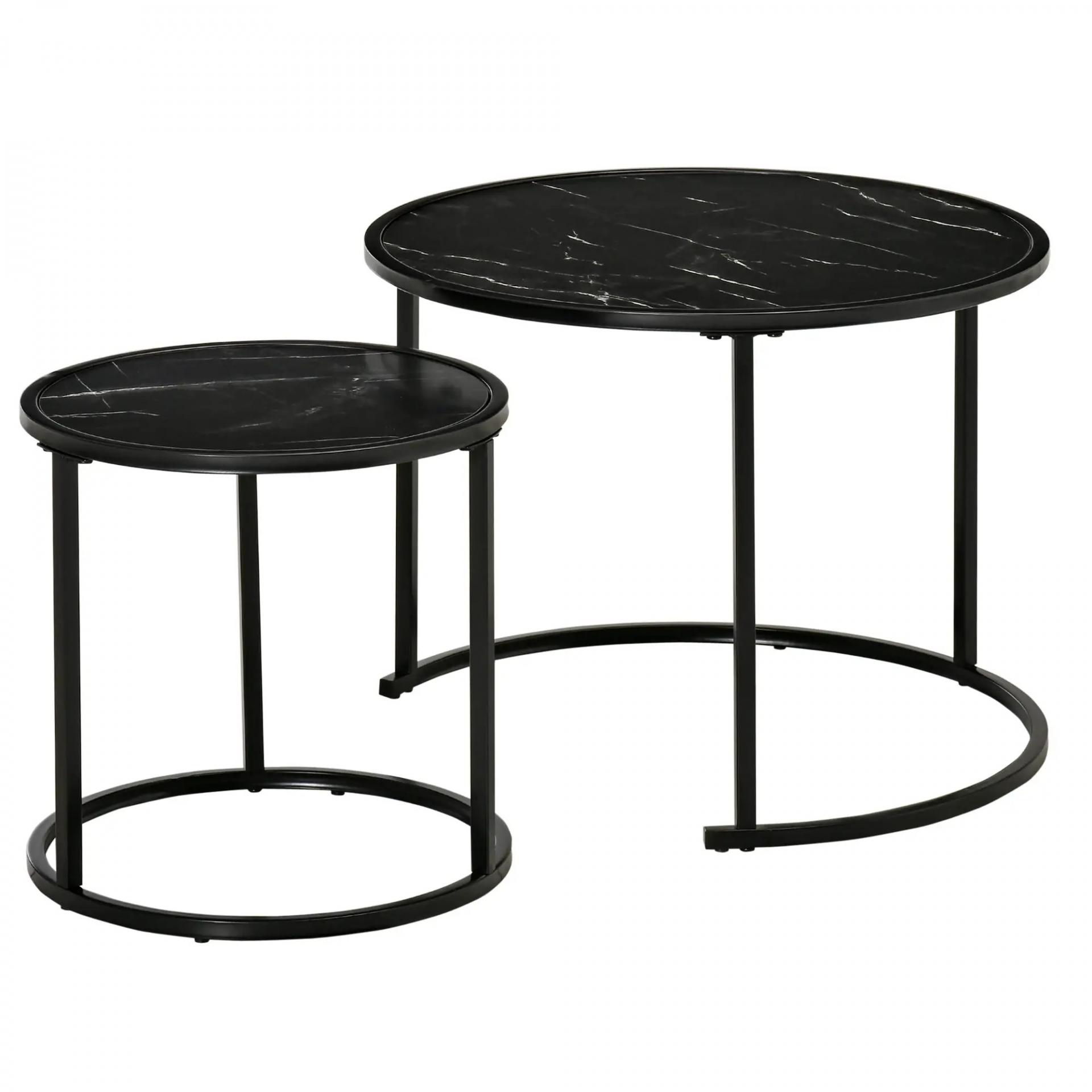 Juego de 2 Mesas Auxiliares Redondas Apilables Mesas Nidos con Encimera en Efecto de Mármol Ø60x46 cm y Ø40x40 cm Negro