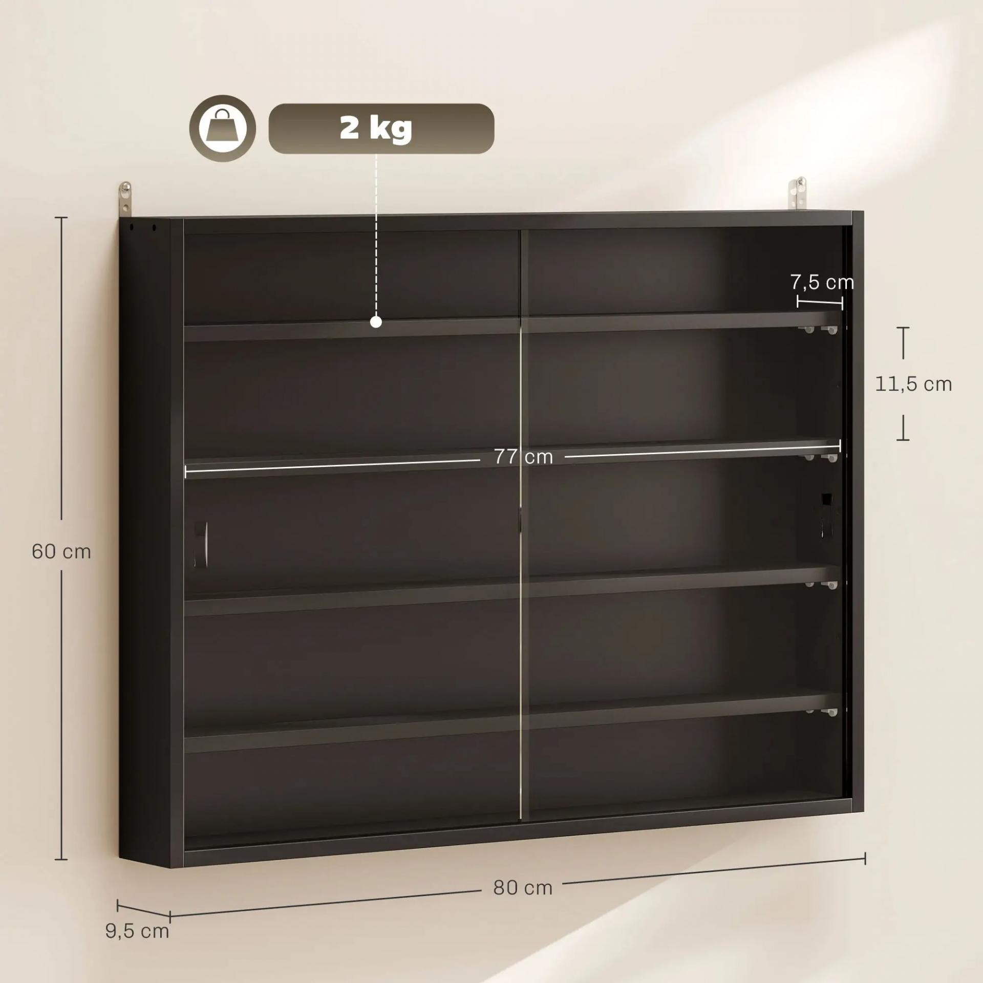 Vitrina de Pared Vitrina de Madera con Estantes Ajustables y 2 Puertas Correderas de Cristal 80x9,5x60 cm Negro