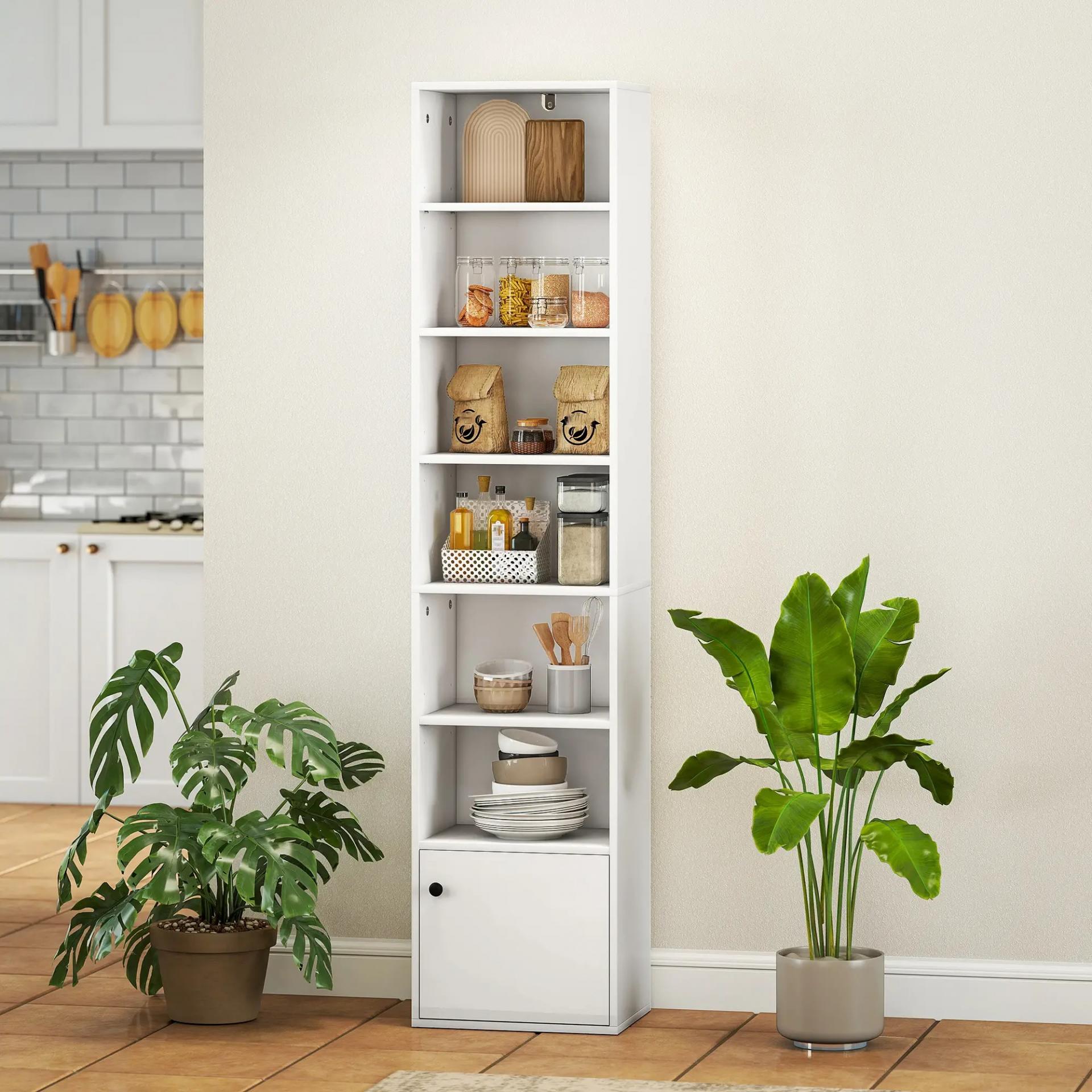 ALMACENAMIENTO ABIERTO Y CERRADO: Esta estantería blanca de HOMCOM ofrece seis baldas abiertas, perfectas para exponer libros y decoración, y un armario inferior con puerta, ideal para guardar objetos fuera de la vista y mantener todo en orden