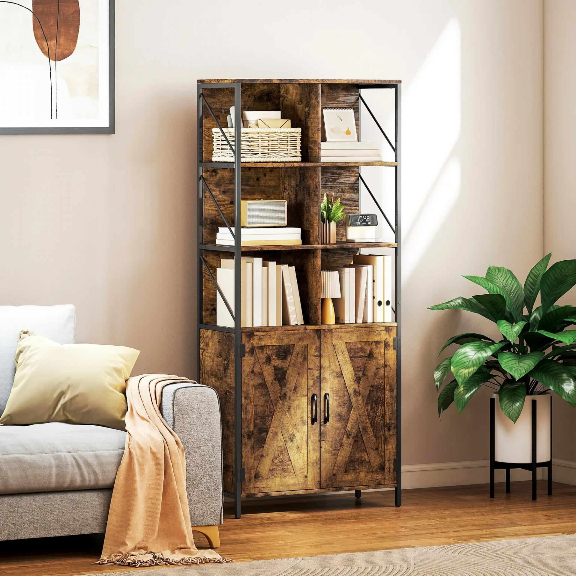 - ESTILO INDUSTRIAL ELEGANTE: La estructura negra con paneles efecto madera rústica y puertas en forma de X aporta a esta librería alta un estilo industrial llamativo y con mucha personalidad