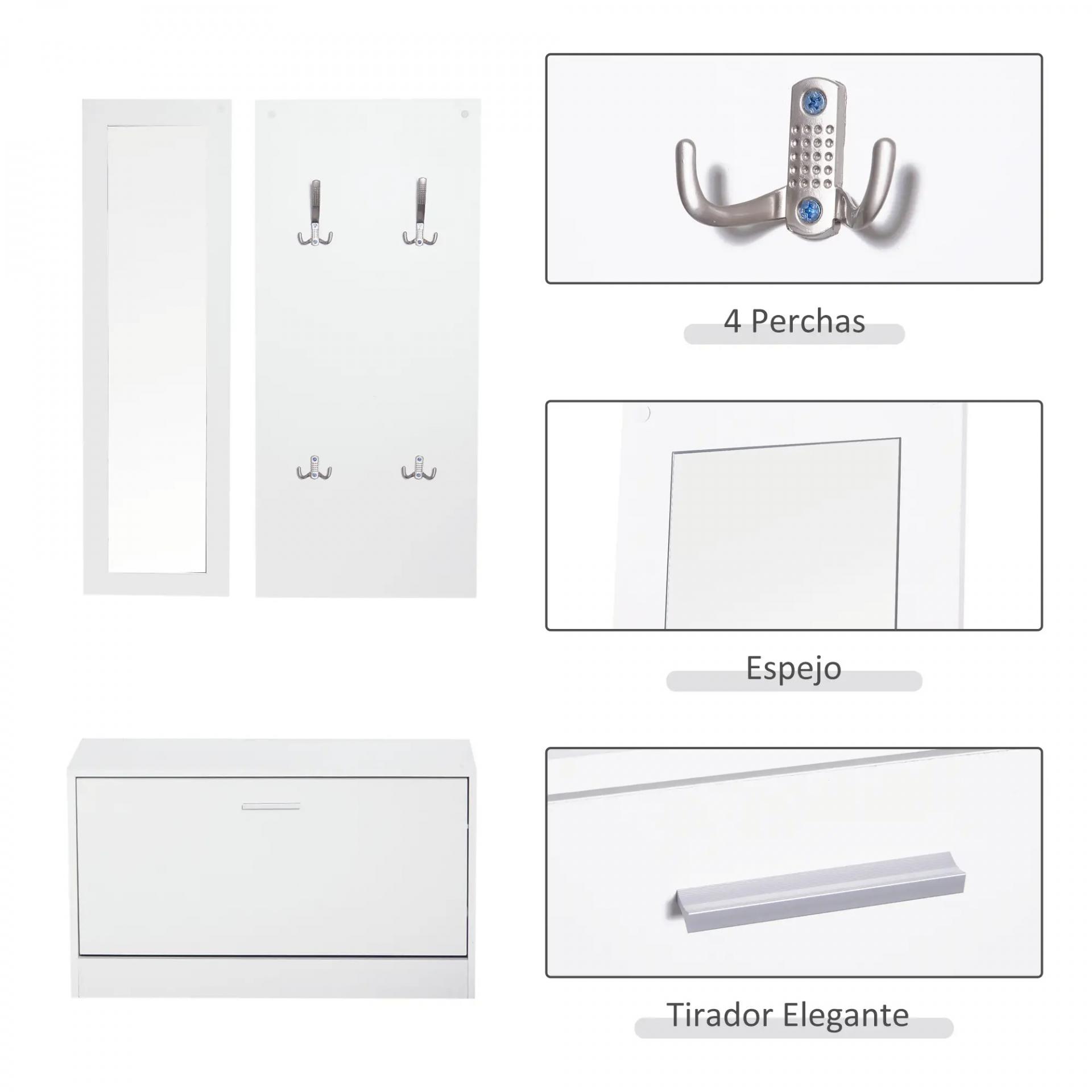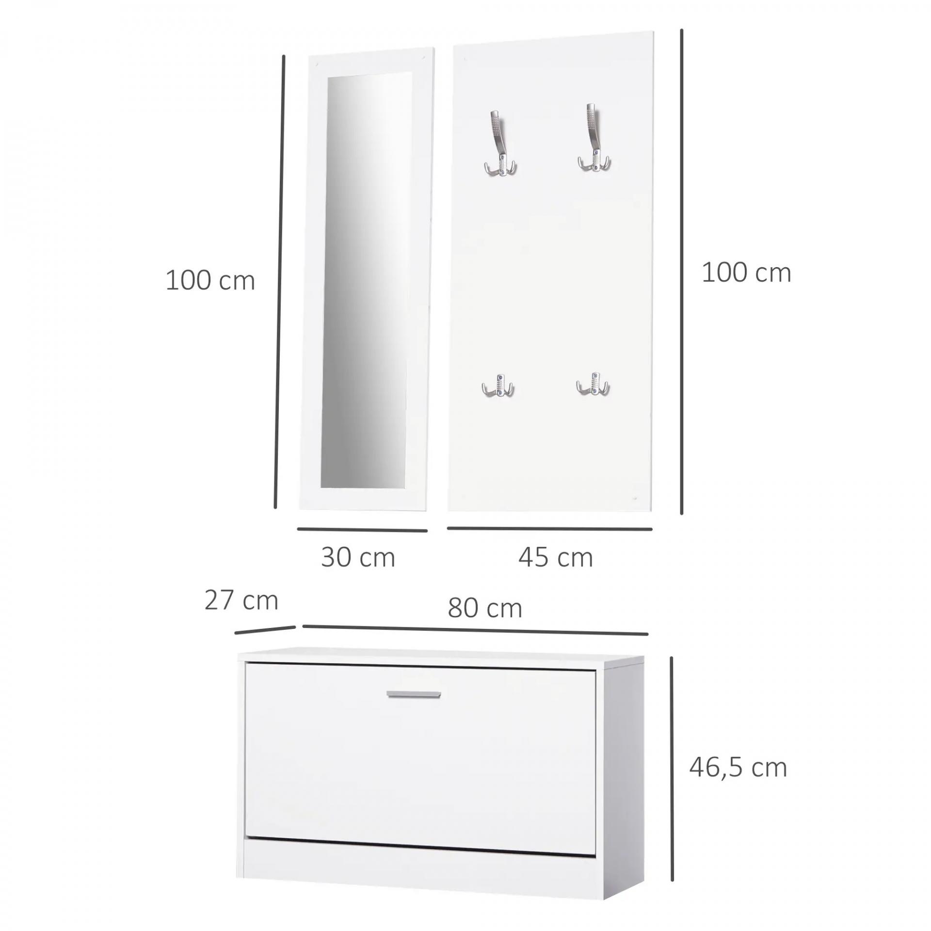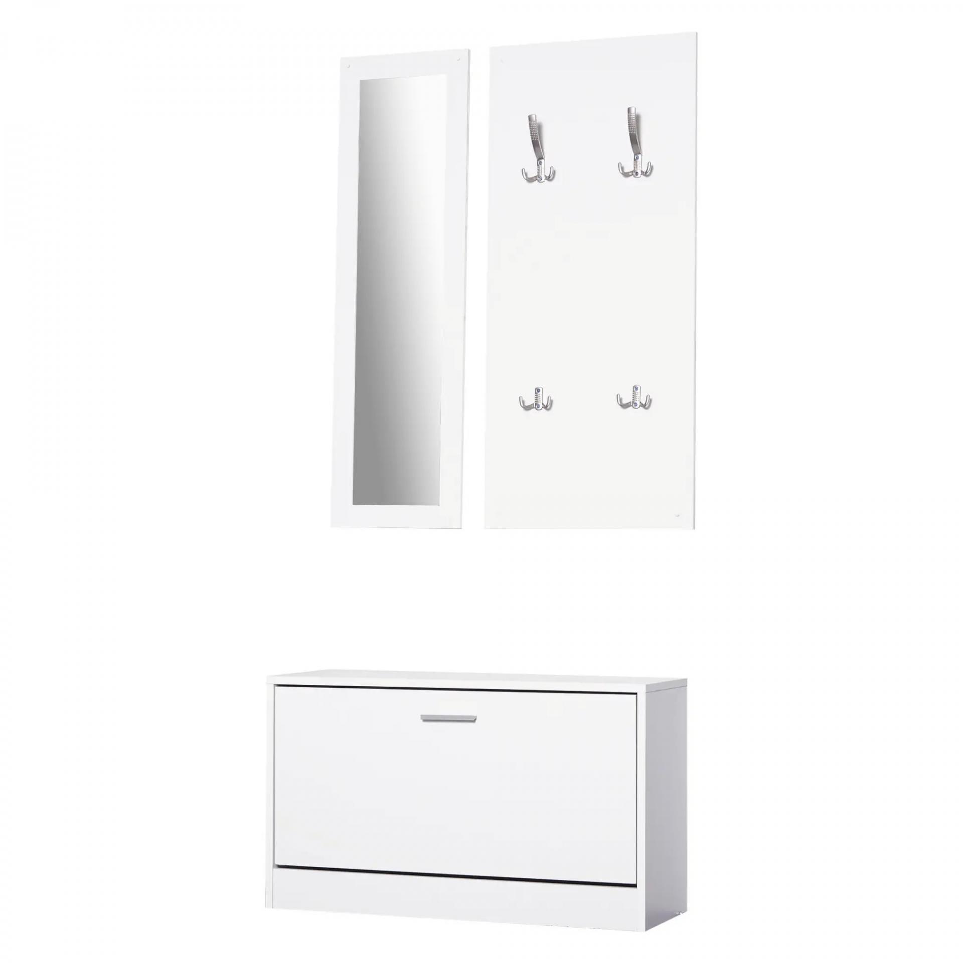 Conjunto de Muebles de Entrada Recibidor Pasillo Set de 3 Piezas Zapatero Espejo Perchero con 4 Ganchos para Colgar Ropa 80x27x46,5cm Blanco