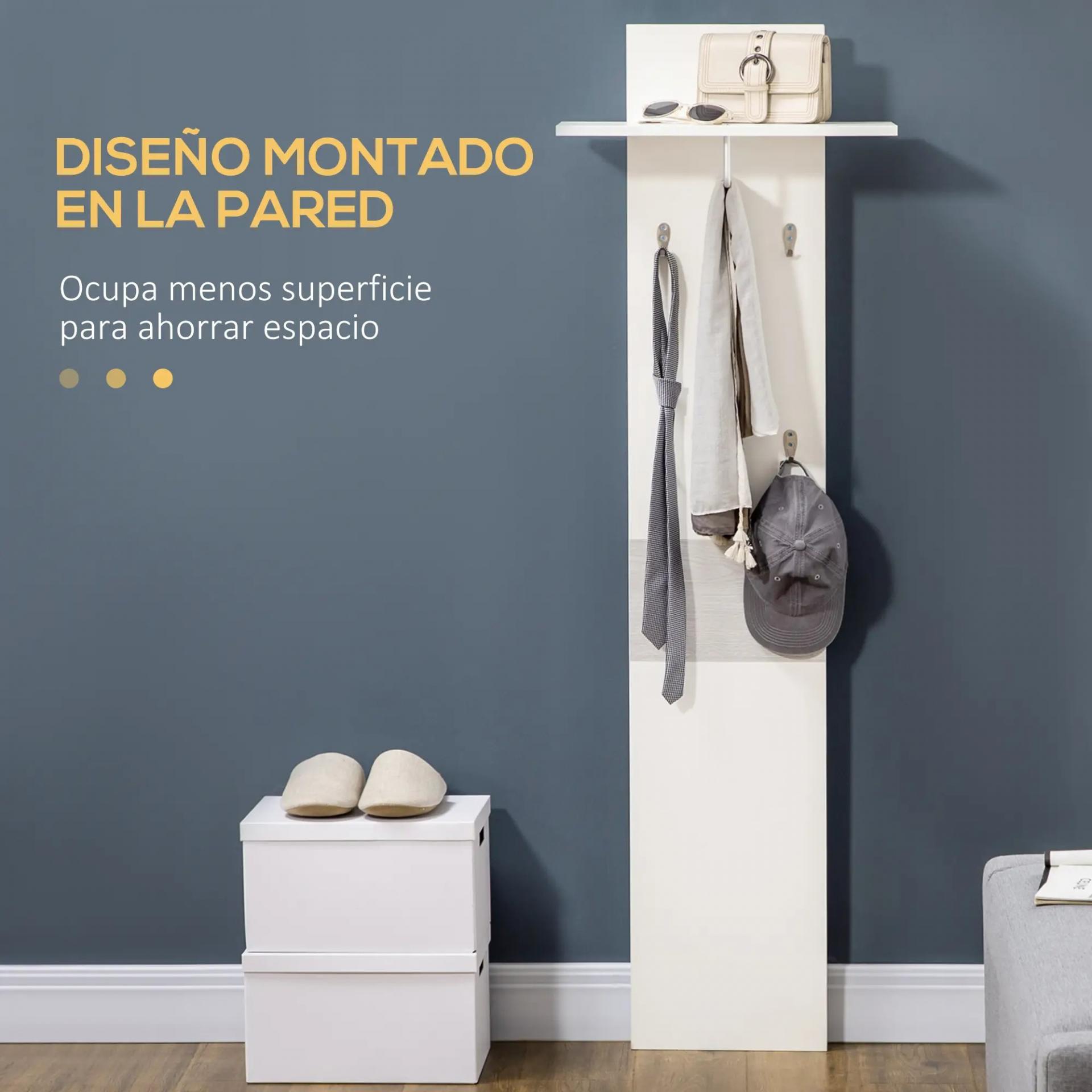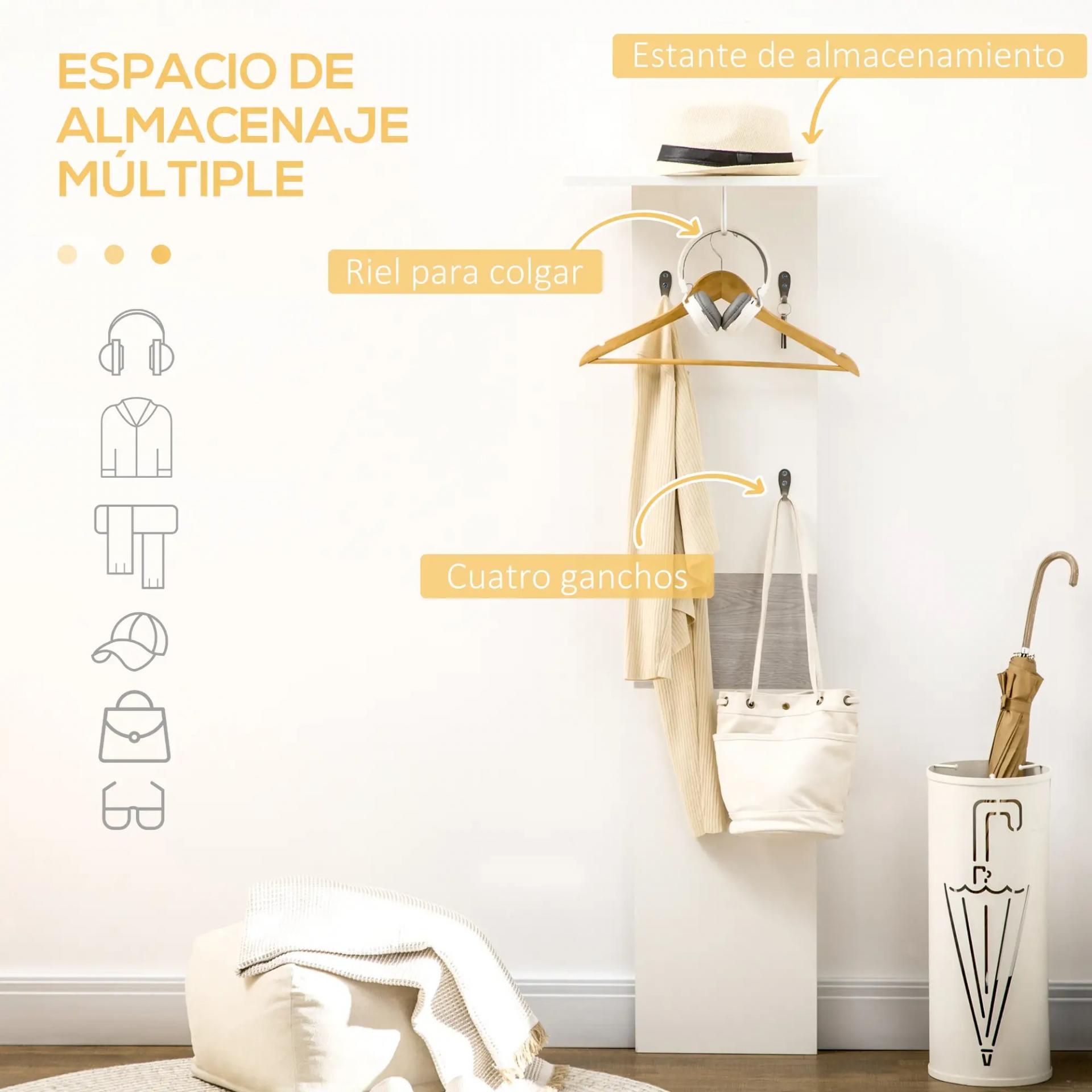 - ESPACIO PARA EXHIBIR Y COLGAR: Dispone de 4 ganchos para colgar, un pequeño estante superior para exhibir decoraciones, una planta o incluso una pequeña caja de almacenaje. Y justo debajo una pequeña barra para poder colgar si es necesario alguna prenda más delicada en percha