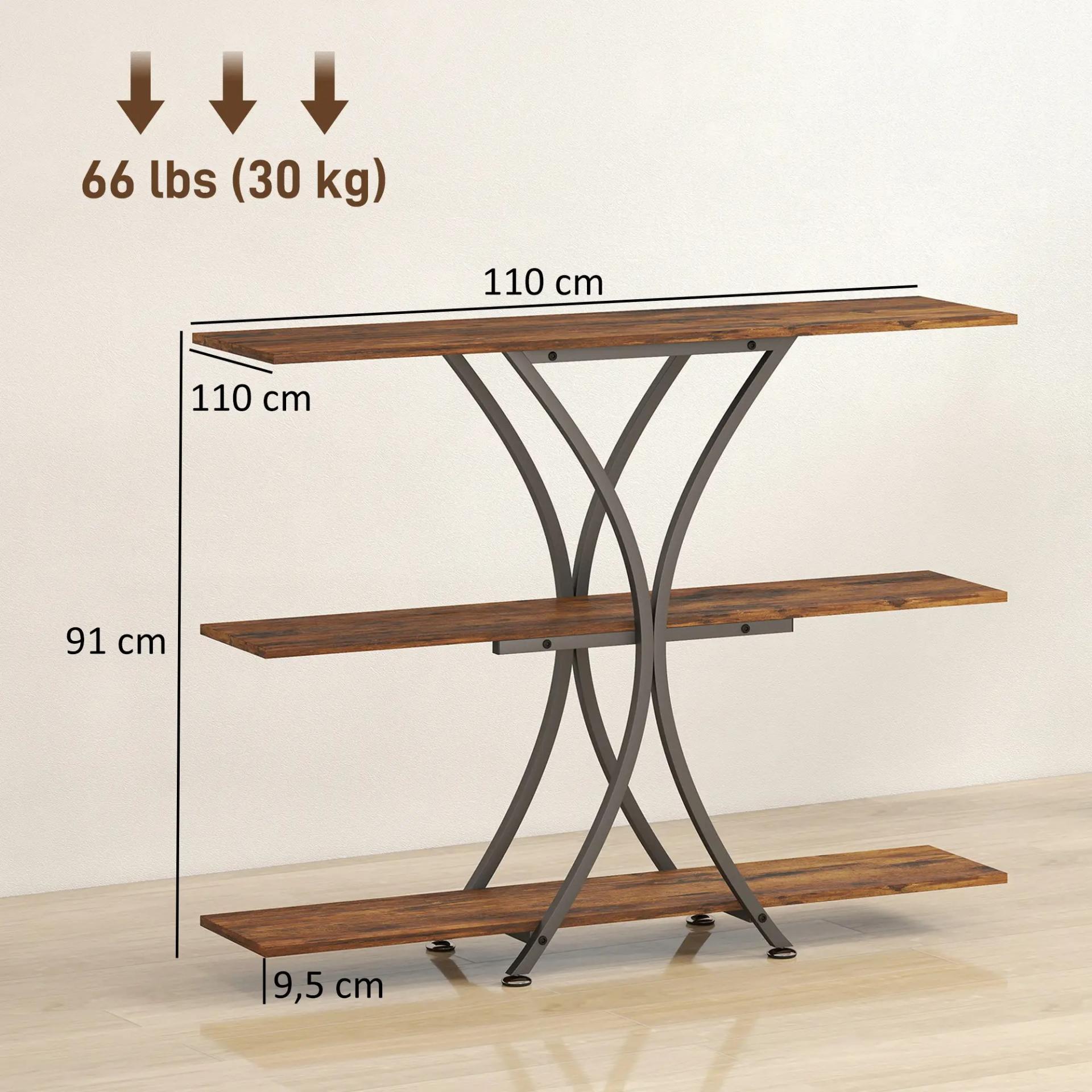 MEDIDAS TOTALES: 110x30x91 cm (LxANxAL). Carga máxima: 30 kg (total), 10 kg (encimera) y 10 kg (cada estante). La mesa de sofá requiere montaje sencillo