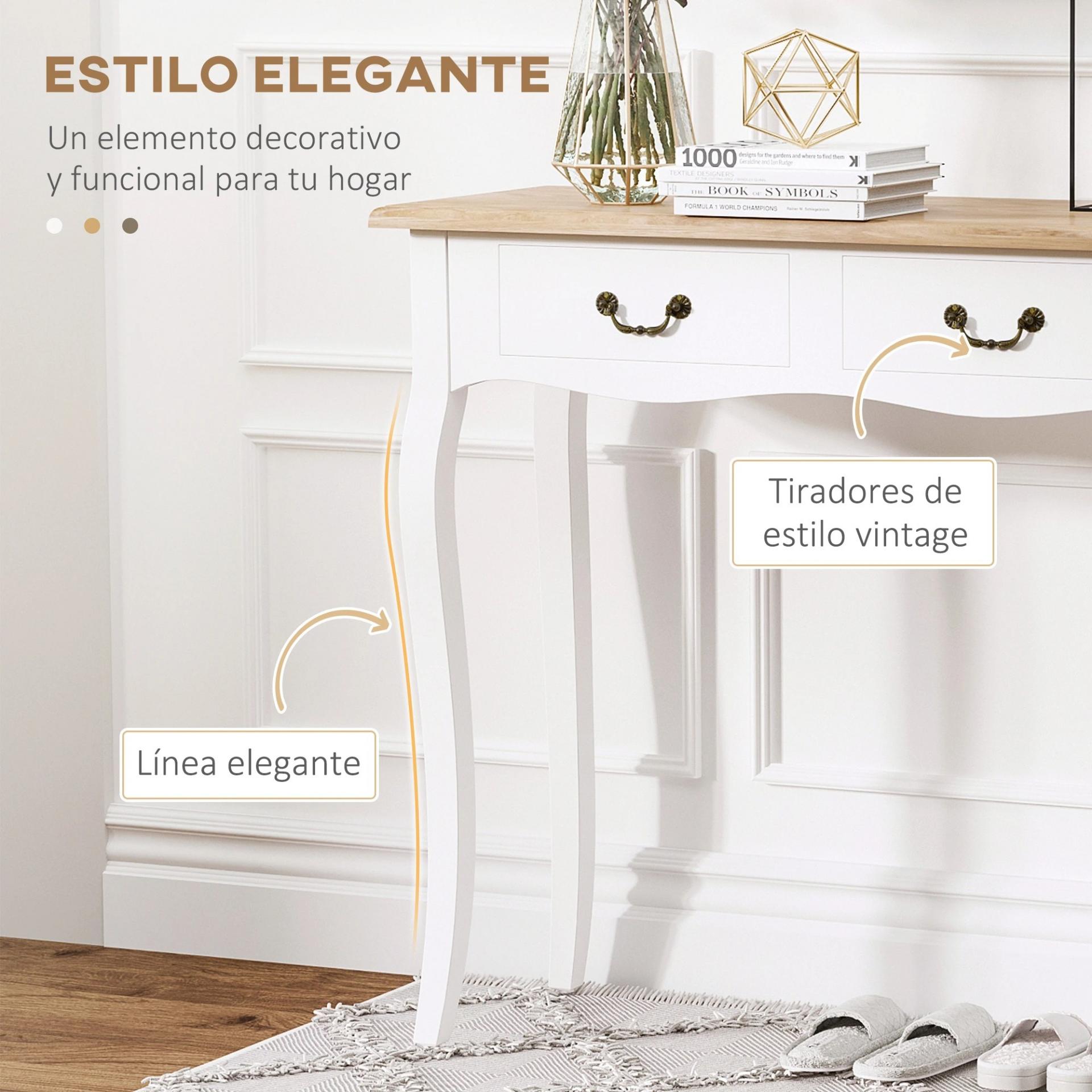 CONSOLA DE RECIBIDOR ESTILO RETRO: Esta consola estrecha es el mueble auxiliar que tu hogar estaba esperando. Con su diseño de estructura de madera en blanco y encimera en tono madera natural, esta consola para entrada aportará un toque de calidez y estilo a tu hogar