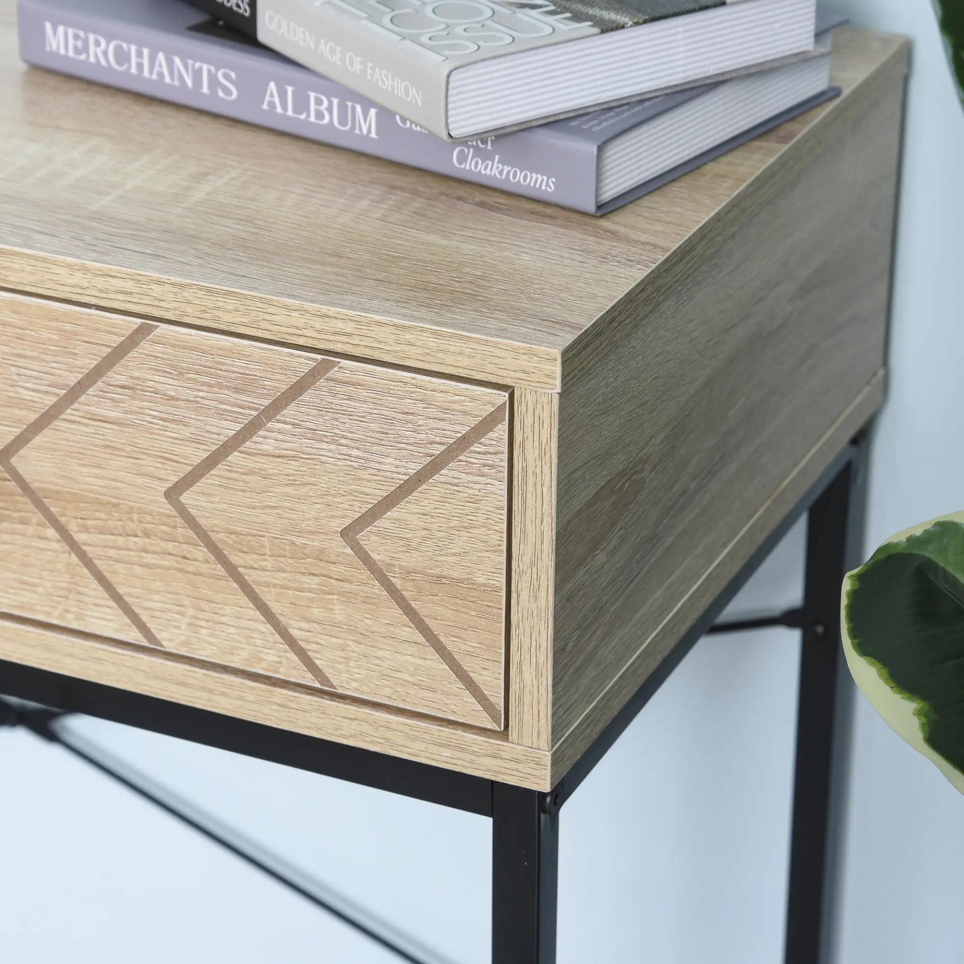 - CON 2 CAJONES: Esta consola cuenta con 2 cajones con espacio útil de 37,5x28,5x8 cm cada uno, para que puedas guardar en ellos las llaves, la cartera y otros objetos pequeños de uso cuotidiano. Los frontales cuentan con un bonito grabado en zigzag y tirador metálico cuadrado