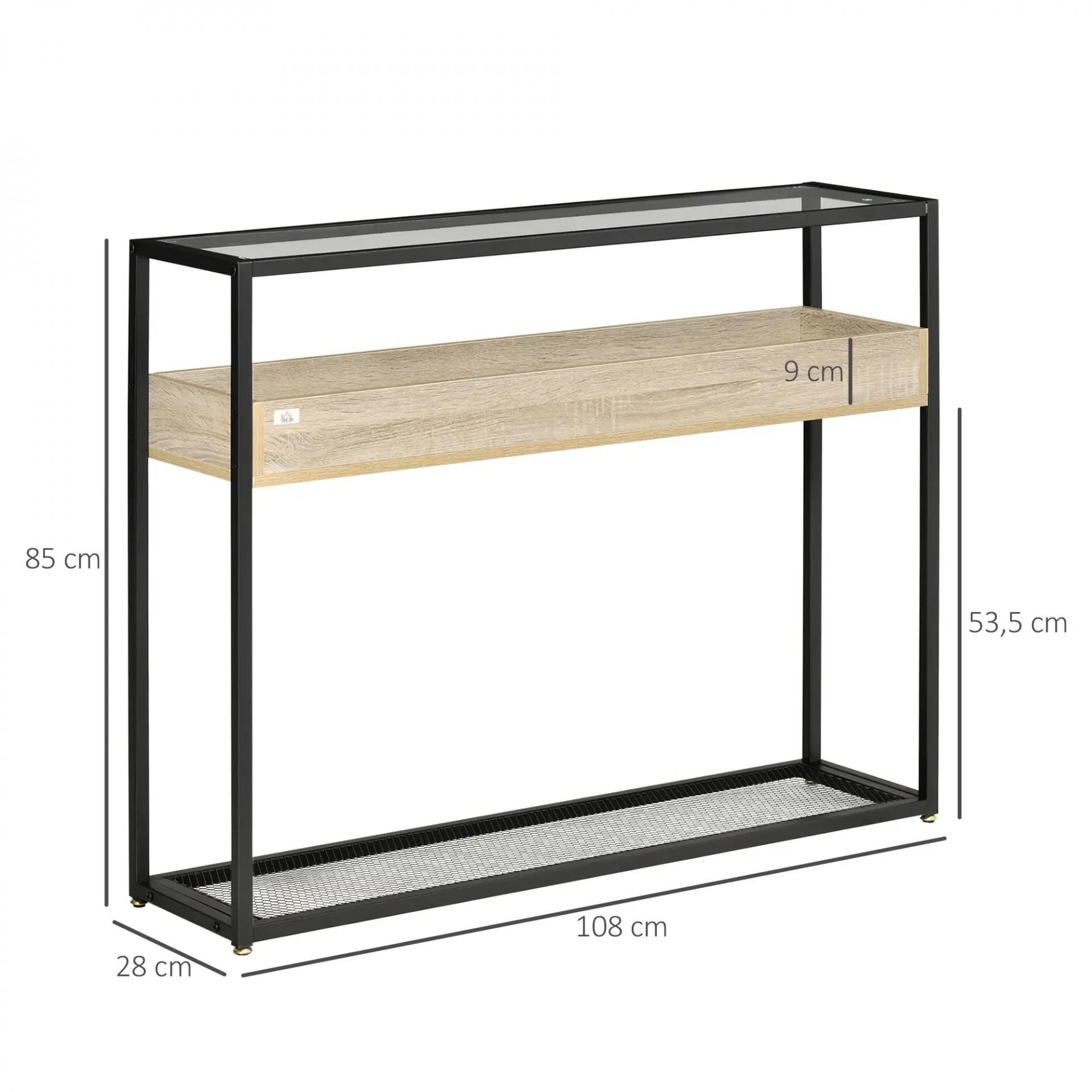 Mesa Consola de Entrada 108x28x85 cm Mueble Recibidor con Encimera de Cristal Estante y Rejilla Inferior Marco de Acero para Pasillo Salón Extremo del Sofá Negro