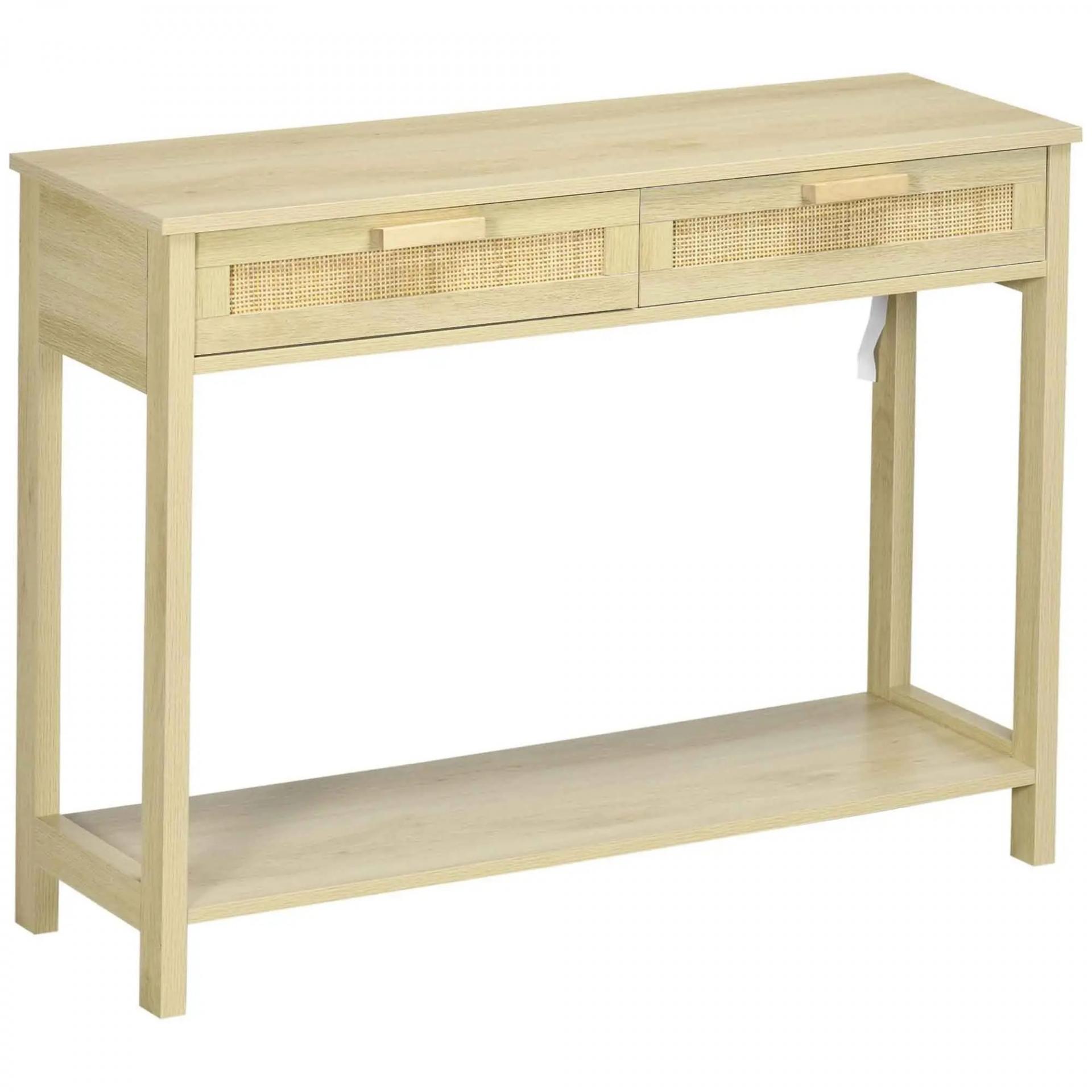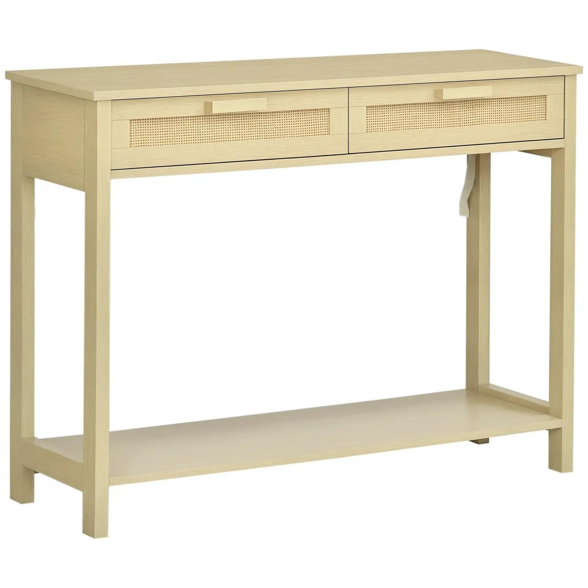 Mesa Consola Mesa de Entrada con 2 Cajones de la Superficie de Ratán y Estante Inferior para Pasillo Salón Dormitorio de Estilo Rústico 100x30x76 cm Natural