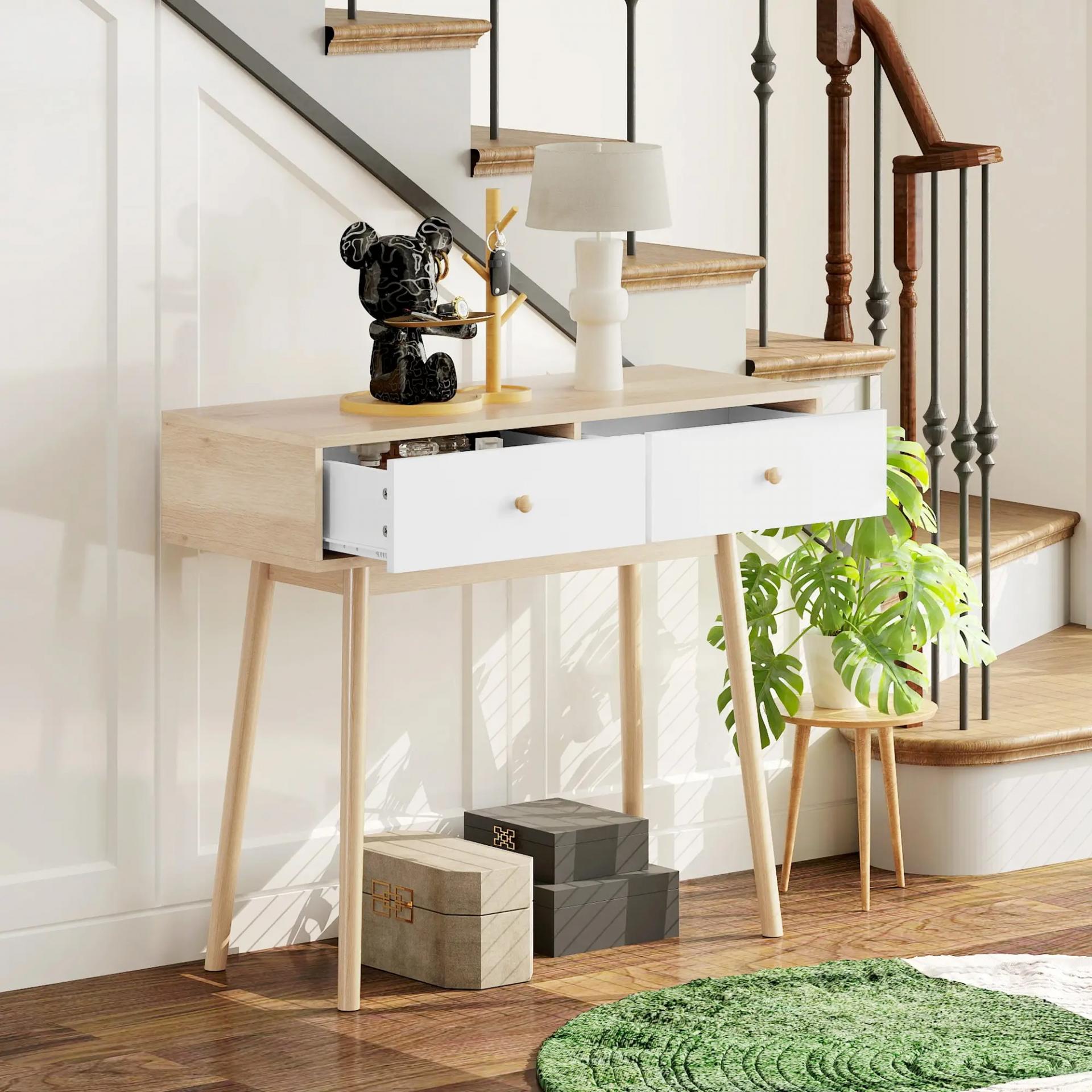 CAJONES DE ALMACENAMIENTO PRÁCTICOS: Con dos amplios cajones, esta mesa consola ofrece un espacio ideal para guardar llaves, carteras y otros objetos esenciales. Su amplia superficie permite colocar plantas, decoraciones o fotos familiares con estilo