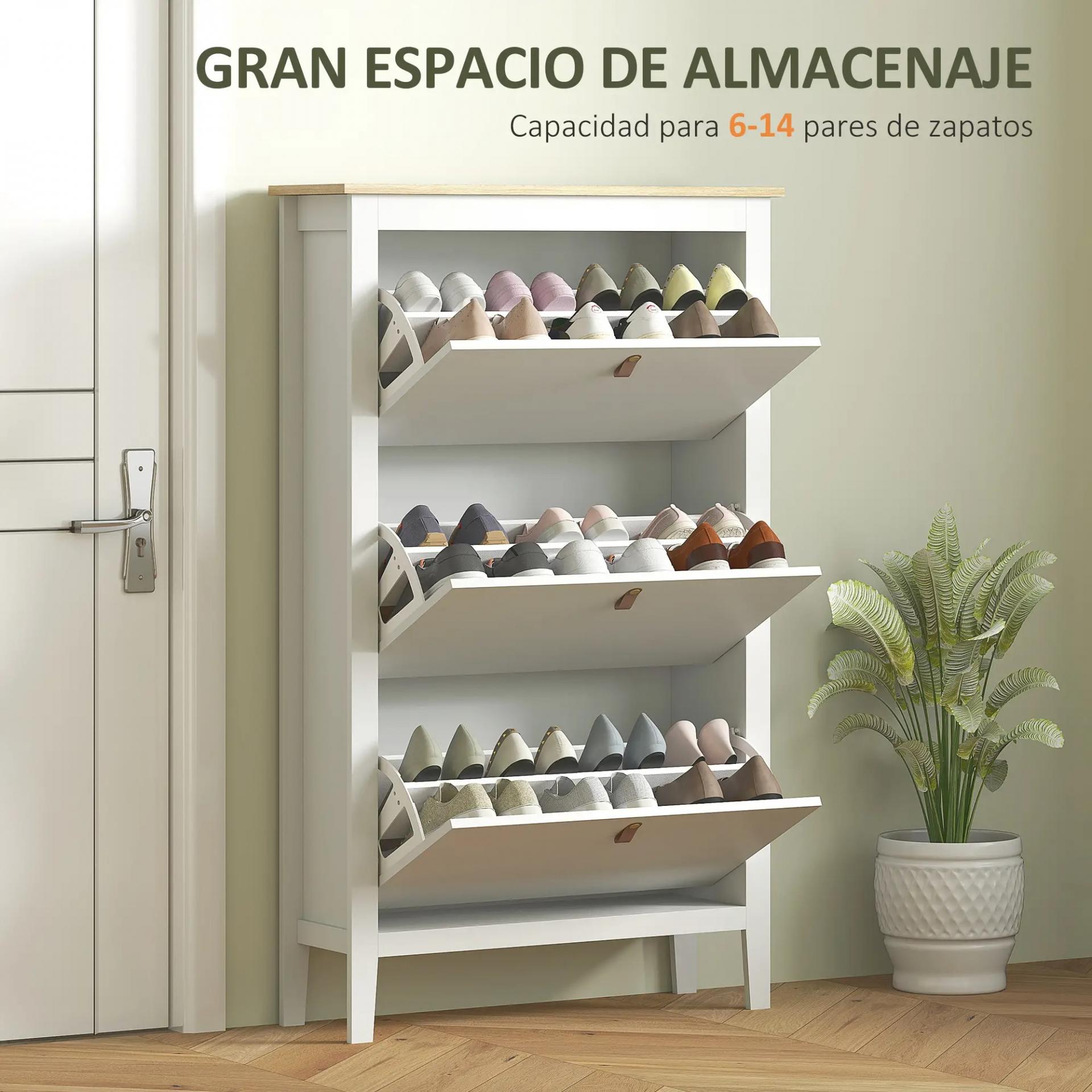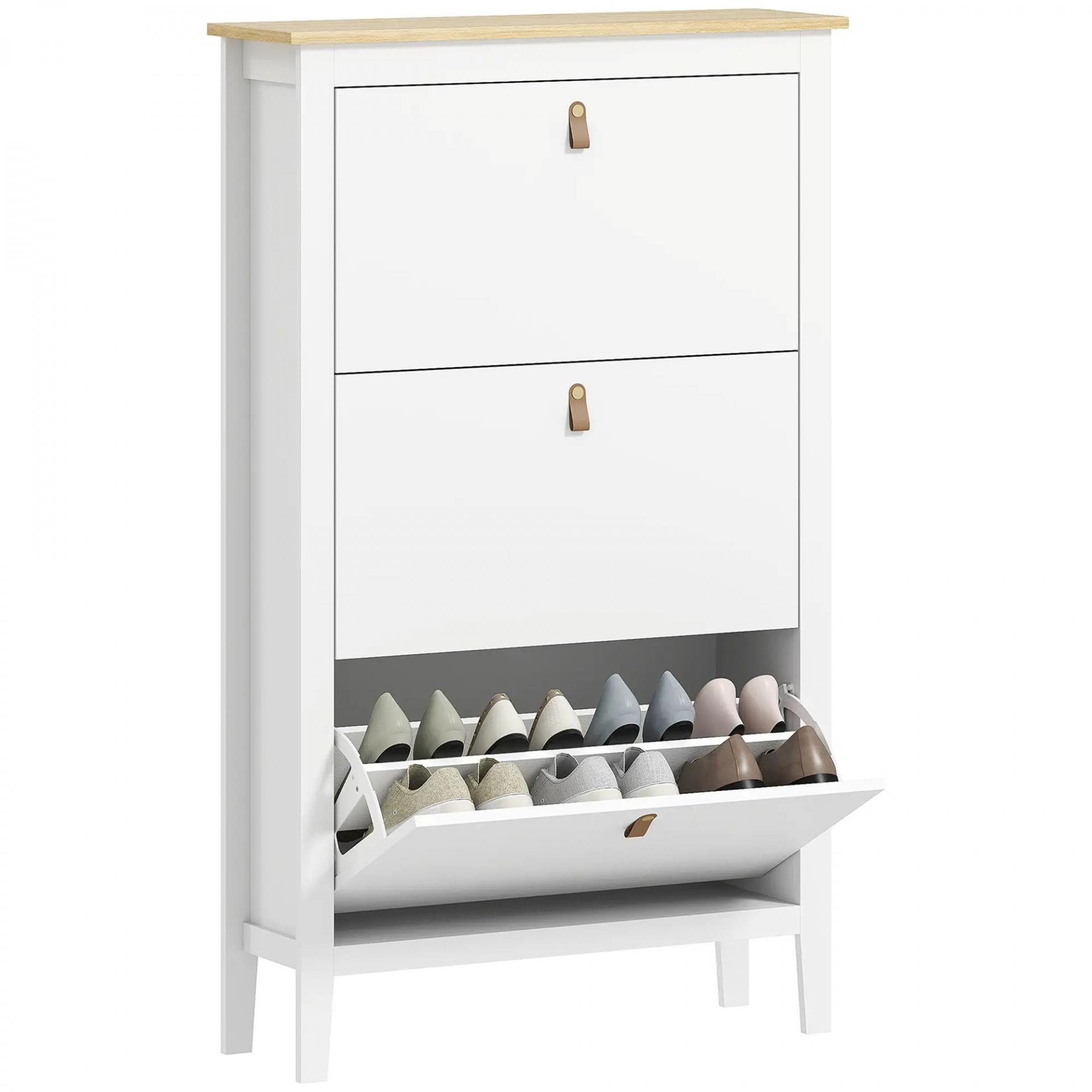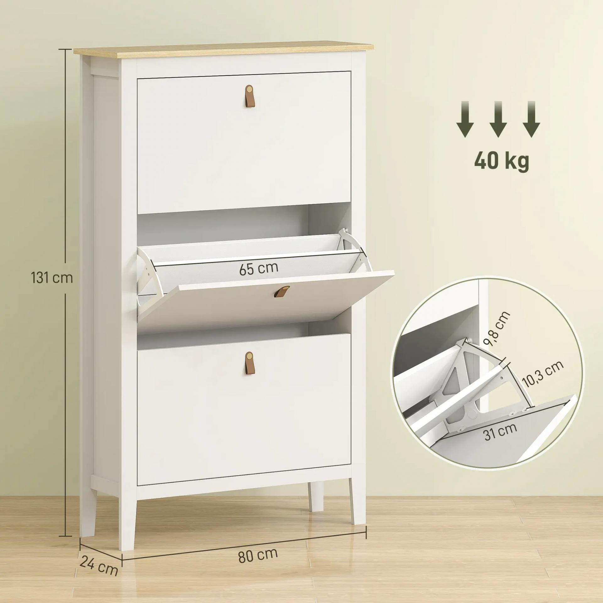 Zapatero Estrecho con 3 Compartimentos y Tiradores de Cuero PU para Pasillos y Recibidores 80x24x131 cm Blanco y Madera