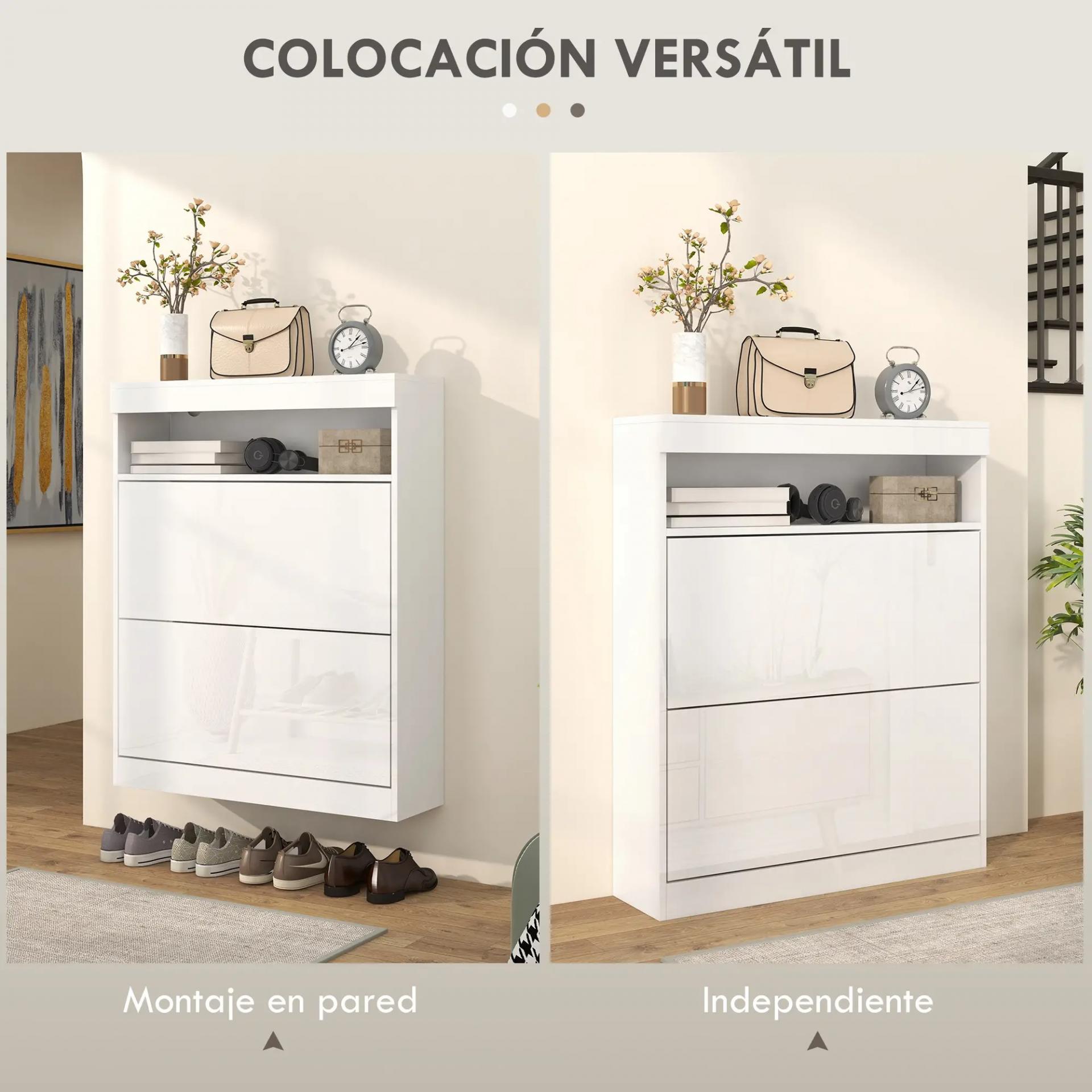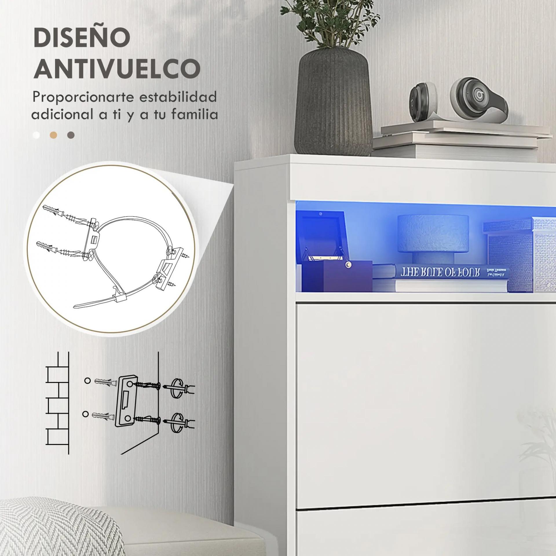 Armario Zapatero con Luces LED y 2 Cajones Abatibles para 12-16 Pares de Zapatos 80x24x99,5 cm Blanco Brillante