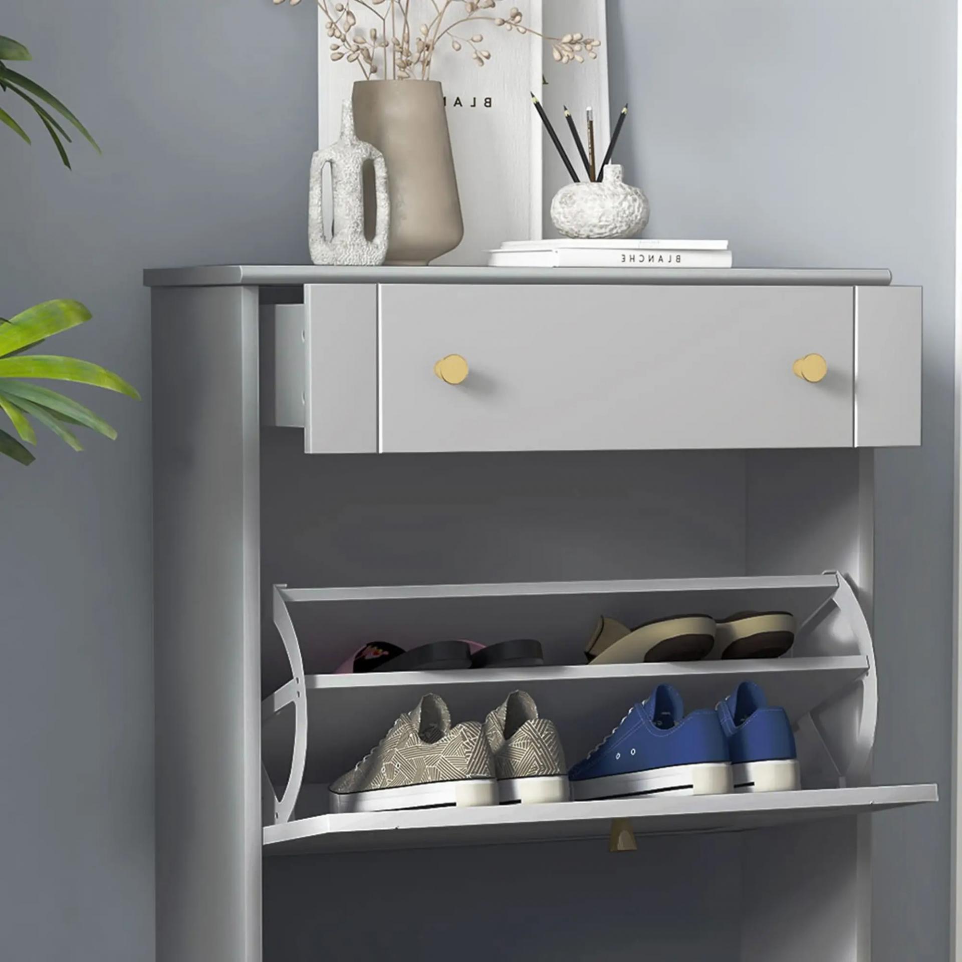 PRÁCTICO Y COMPACTO: Con puertas basculantes y un diseño compacto, este zapatero estrecho es ideal para la entrada o espacios estrechos. Sus elegantes tiradores dorados facilitan la apertura, el cierre y la retirada de los zapatos