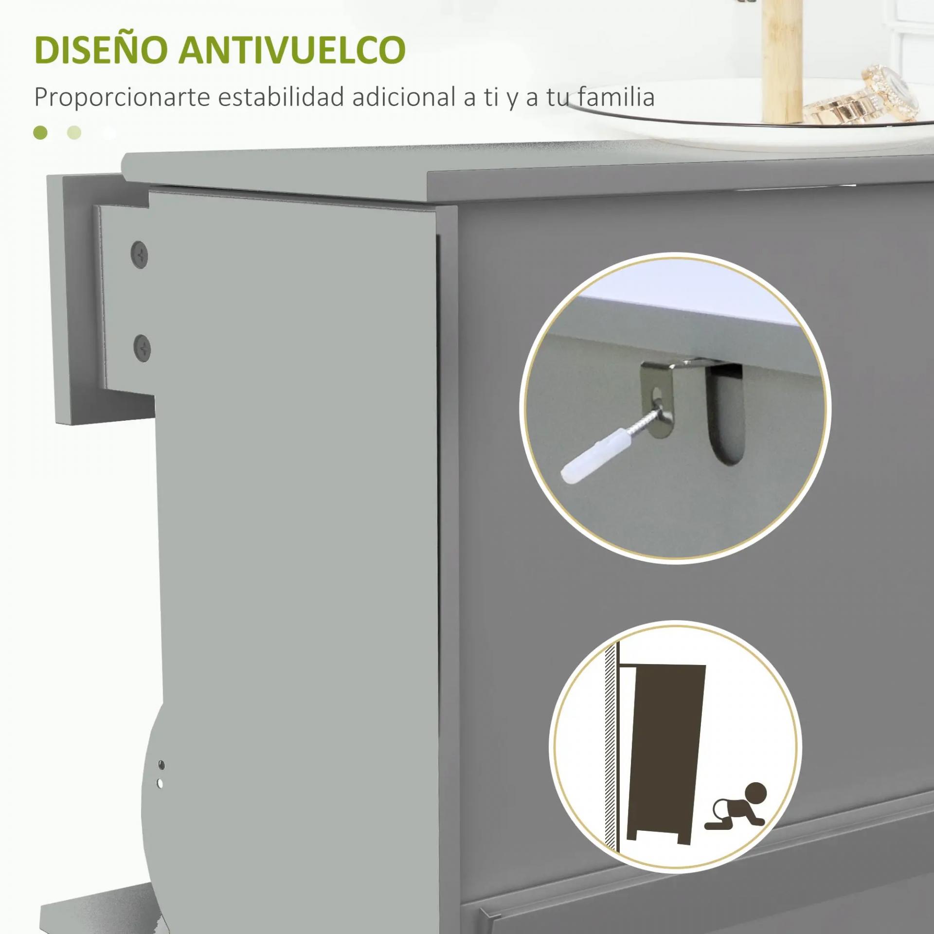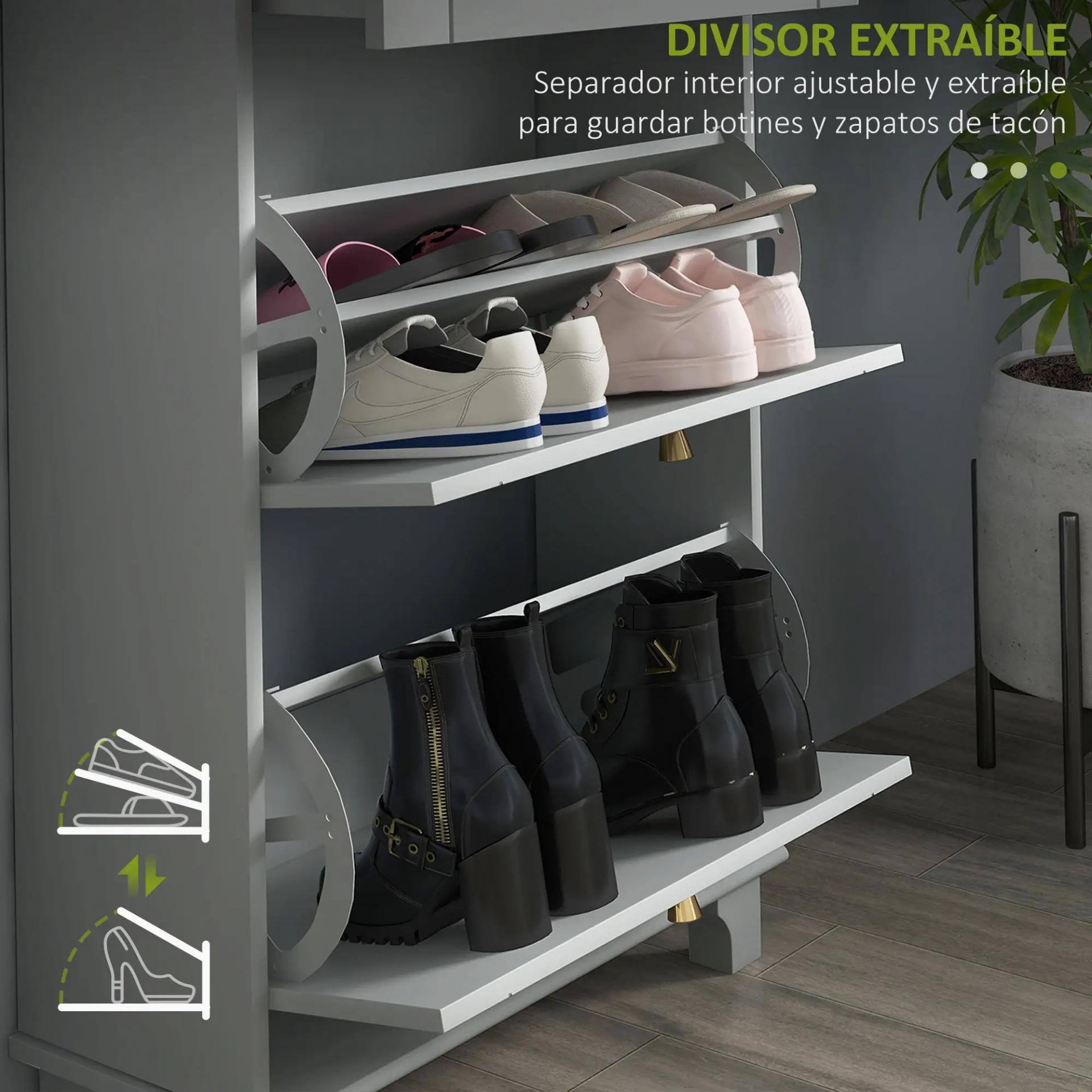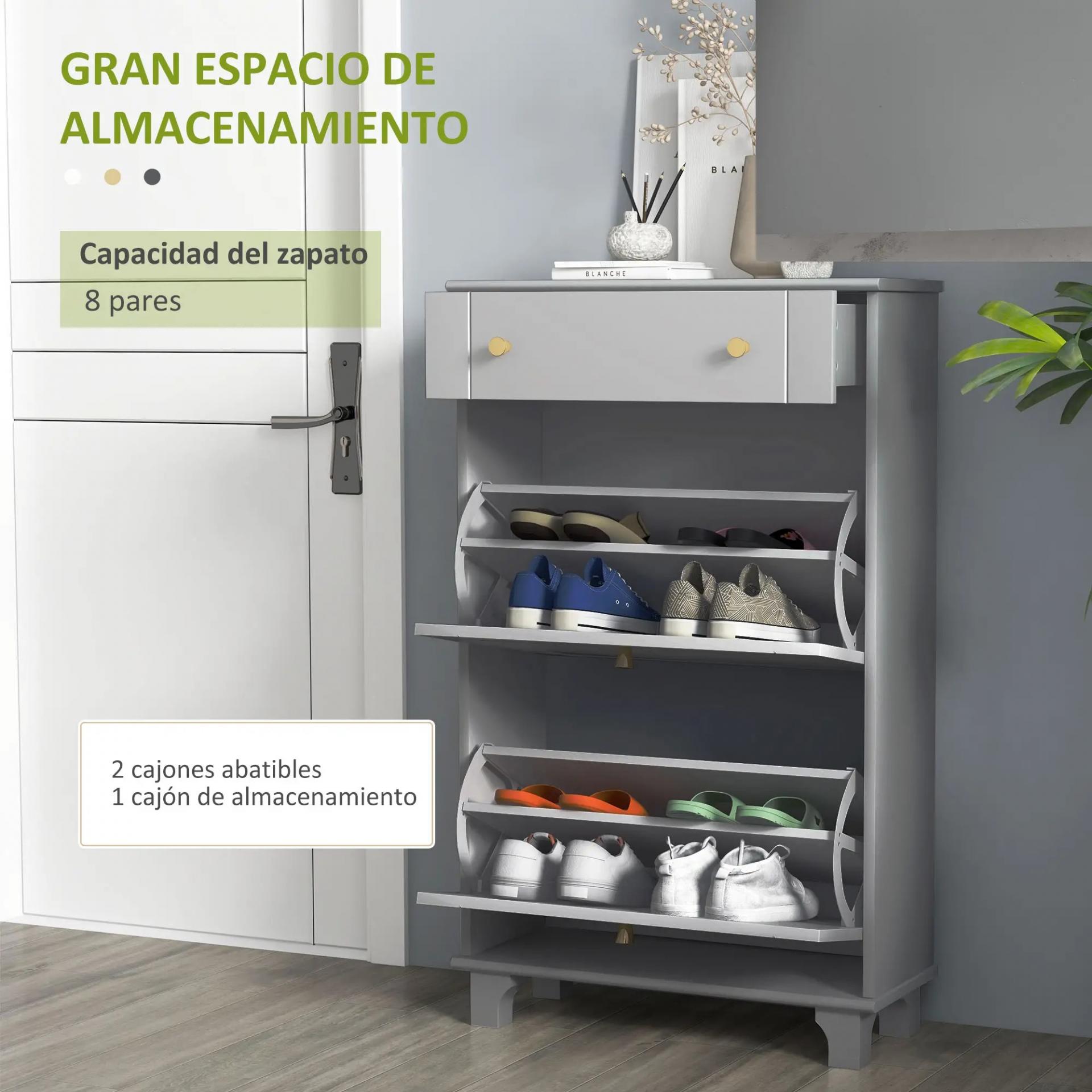 - RESISTENTE Y ESTABLE: Fabricado en MDF y melamina de madera, este mueble zapatero de recibidor de color gris es resistente, fácil de limpiar e ideal para una utilización prolongada. Además, posee un sistema anti-vuelco para mayor estabilidad y seguridad