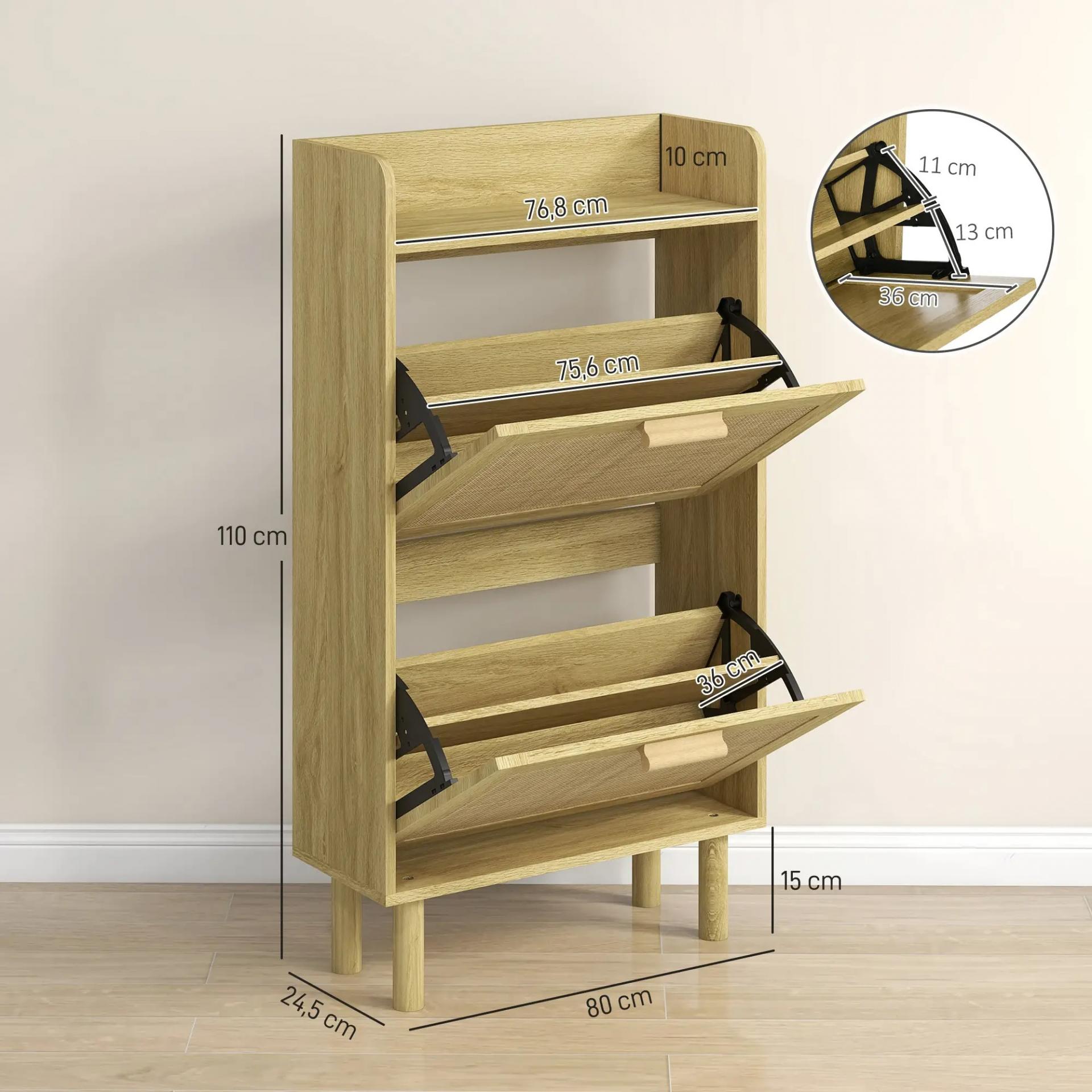 MUEBLE ZAPATERO DE 2 NIVELES: Este mueble zapatero de recibidor dispone de dos cajones abatibles con asas de madera, facilitando la apertura y extracción de los zapatos. Su diseño compacto hace de este zapatero estrecho la solución perfecta para espacios reducidos, adaptándose a la perfección a los rincones más estrechos del recibidor
