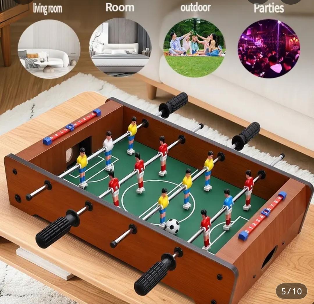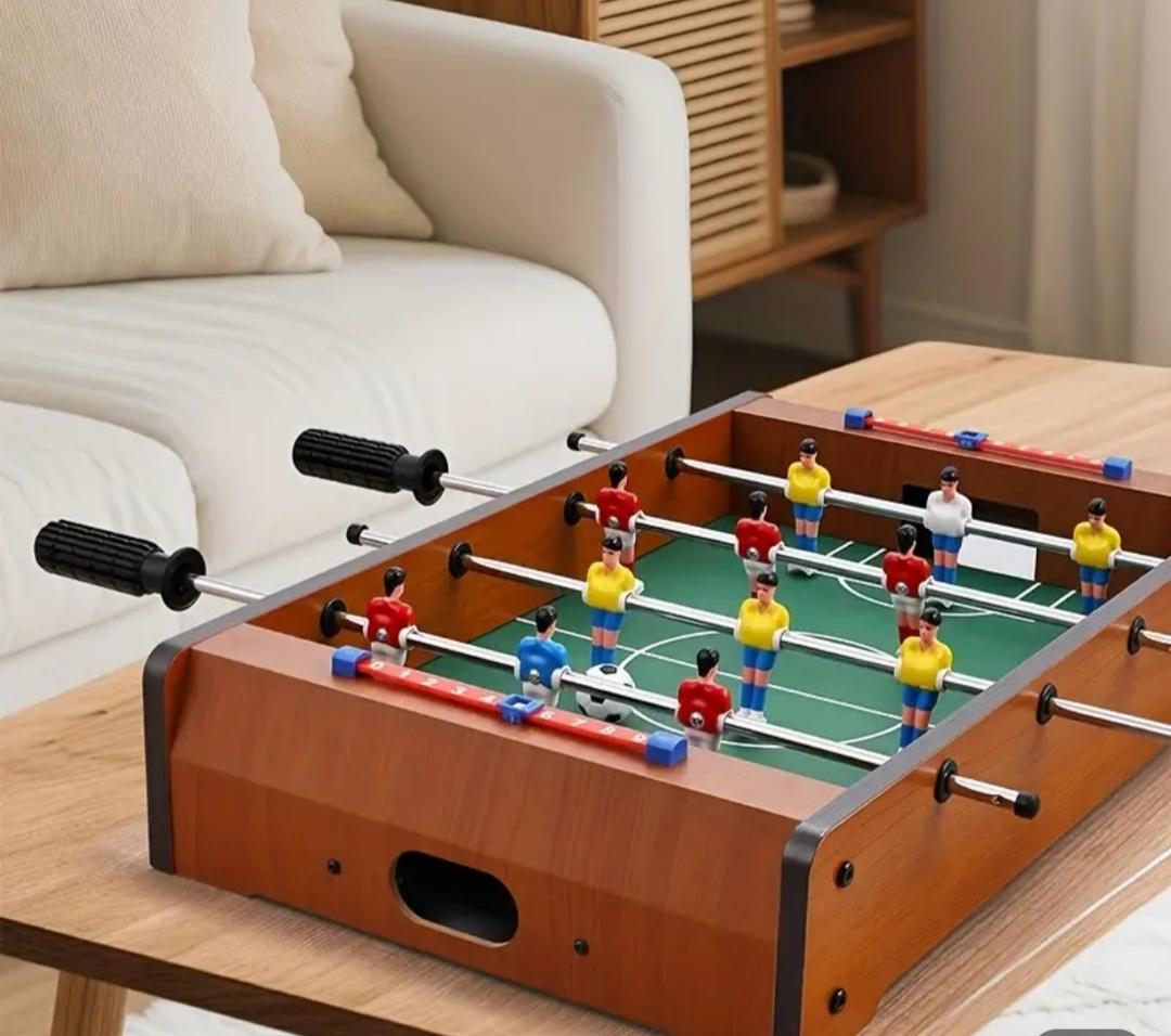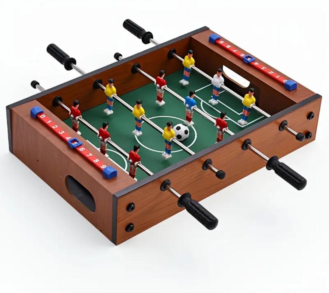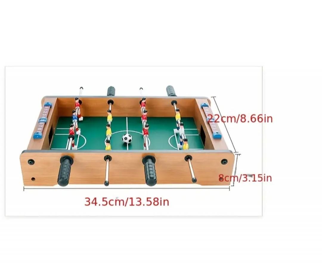 Mini futbolín de madera con diseño clásico, perfecto para dos jugadores. Ideal para colocar sobre una mesa.