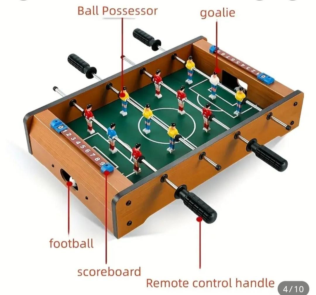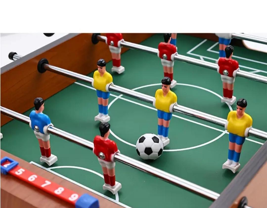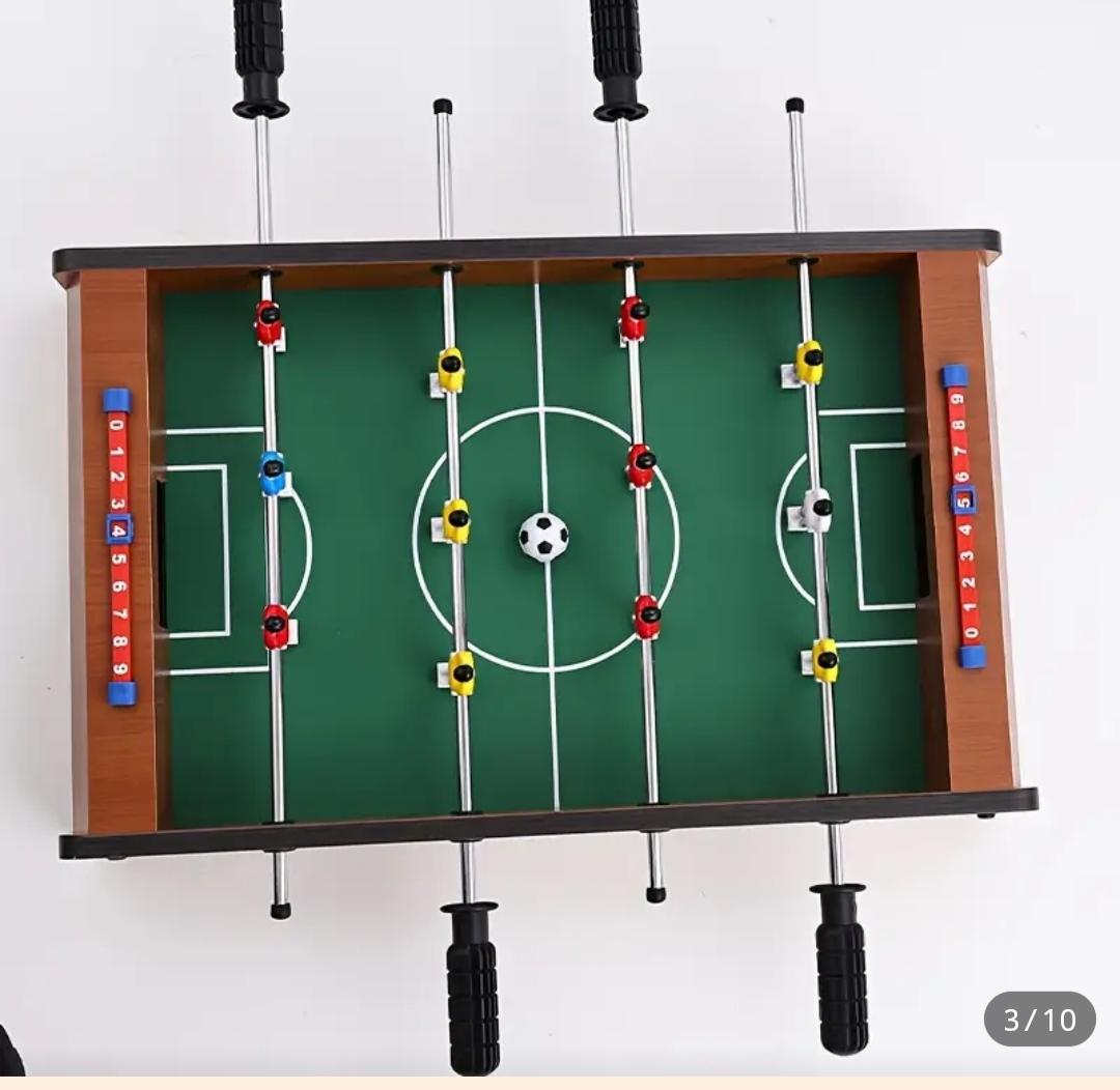Mini futbolín de madera con diseño clásico, perfecto para dos jugadores. Ideal para colocar sobre una mesa.