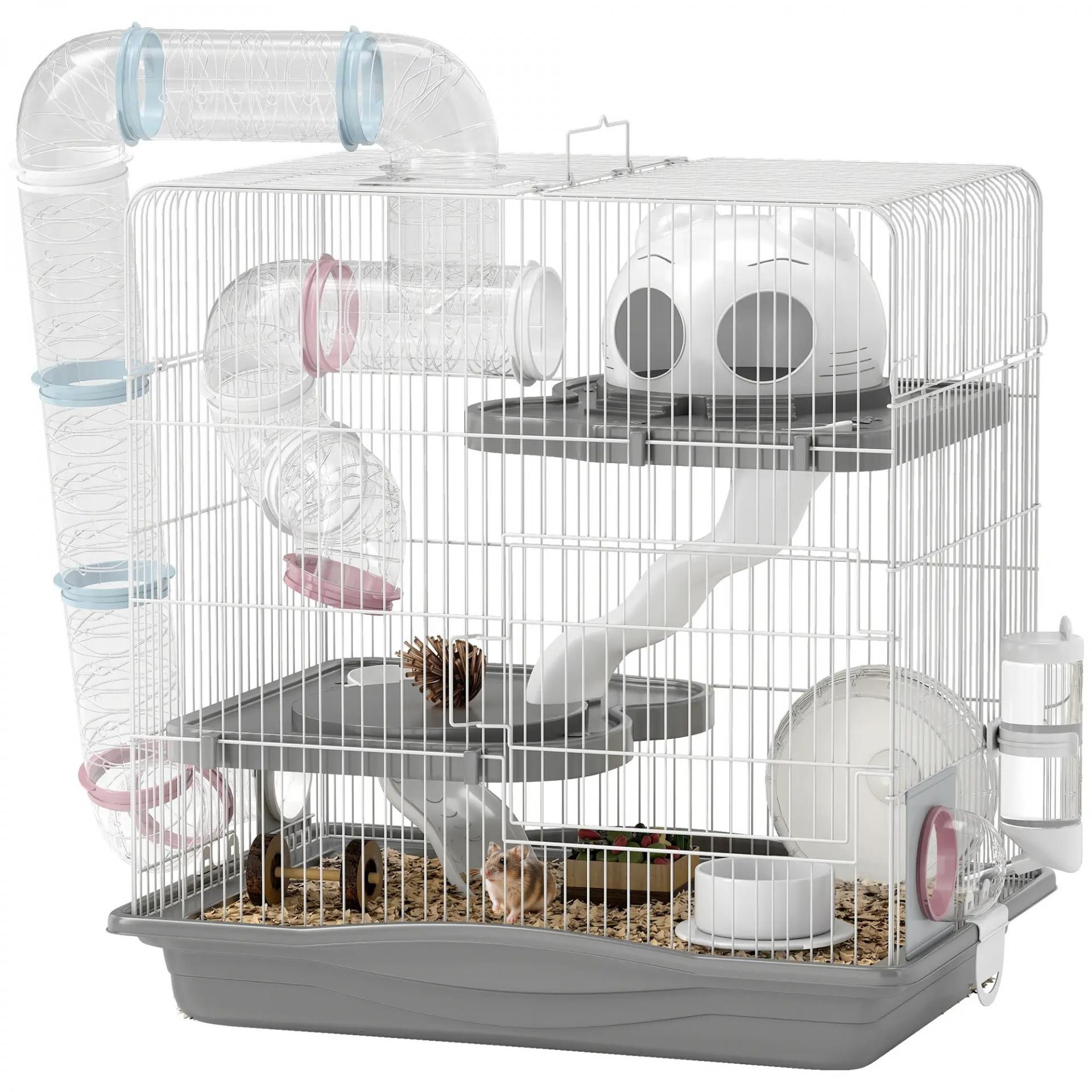 Jaula para Hámster con Túnel Plataformas Cuenco Bebedero Casita Rampas y Rueda de Ejercicio 45x30x45 cm Gris